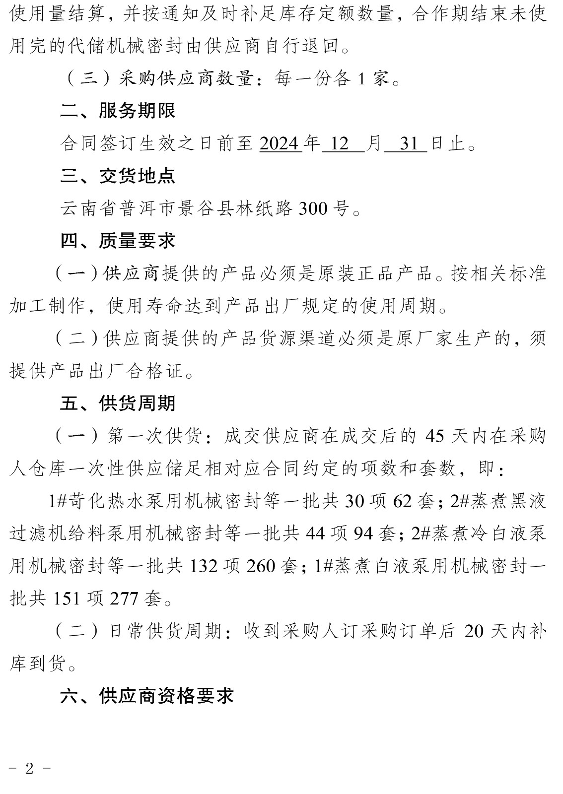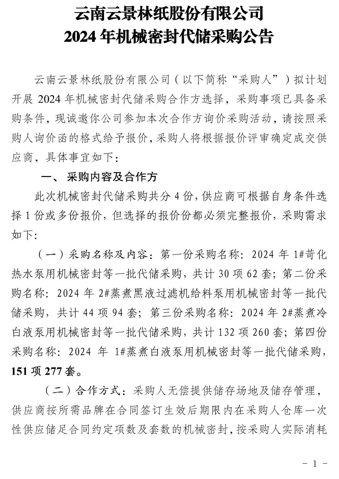 云南云景林紙股份有限公司2024年機(jī)械密封代儲(chǔ)采購公告