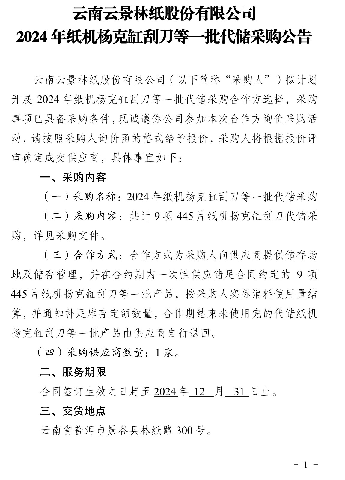 云南云景林紙股份有限公司2024年紙機(jī)揚(yáng)克缸刮刀等一批代儲(chǔ)采購(gòu)公告
