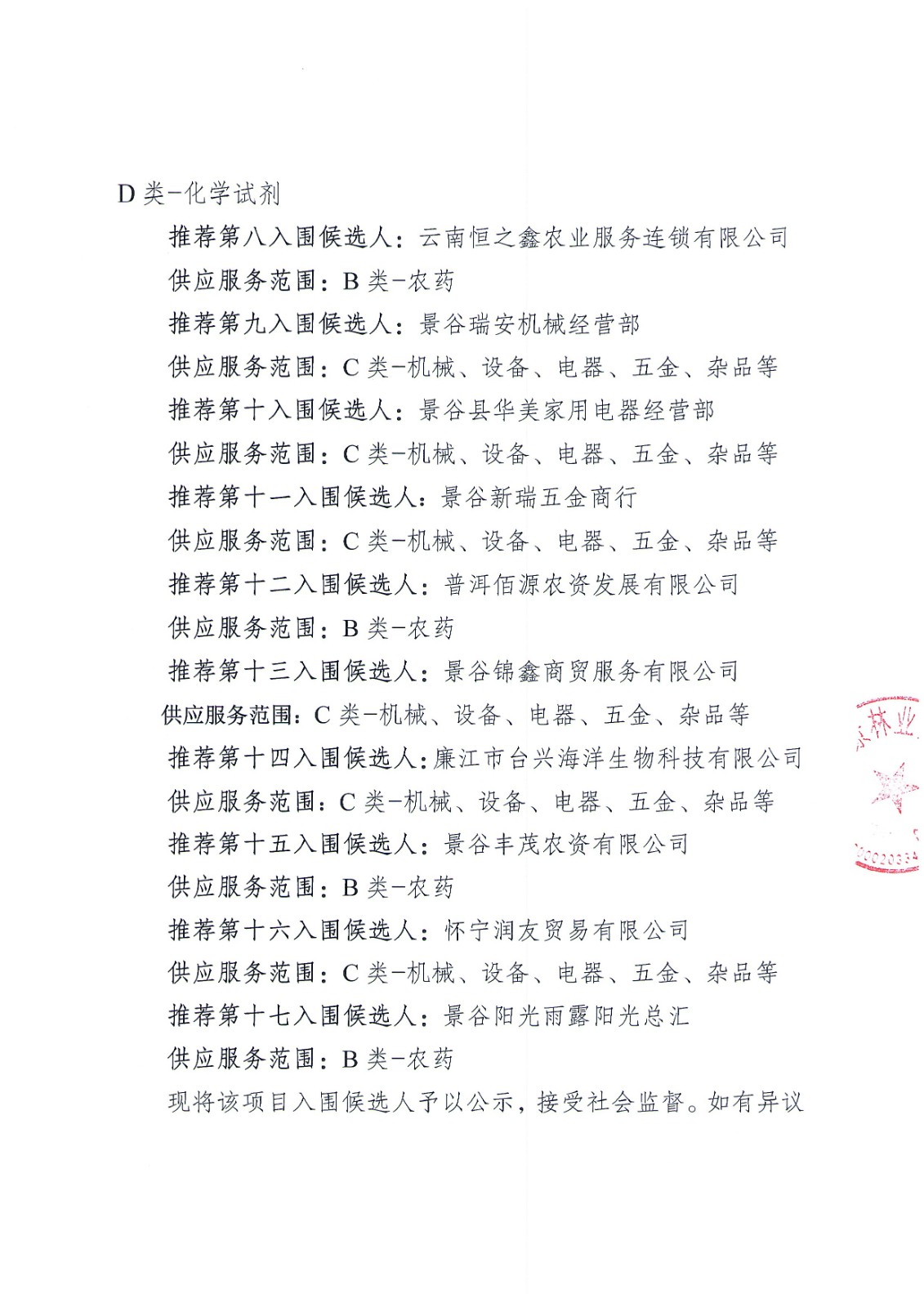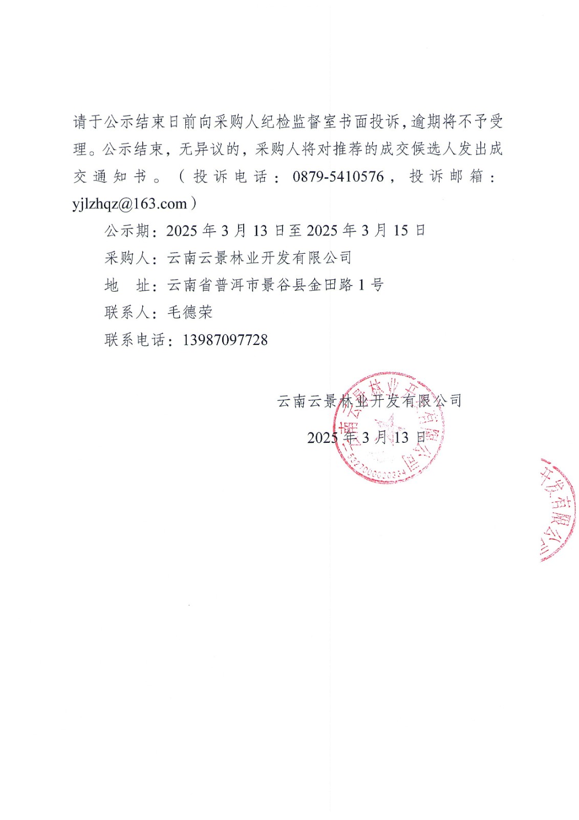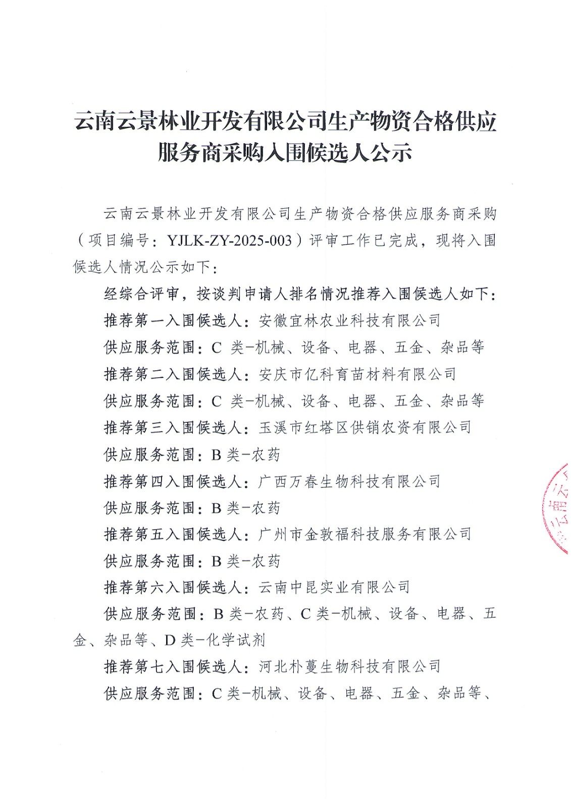 云南云景林業(yè)開發(fā)有限公司生產(chǎn)物資合格供應服務商采購入圍候選人公示