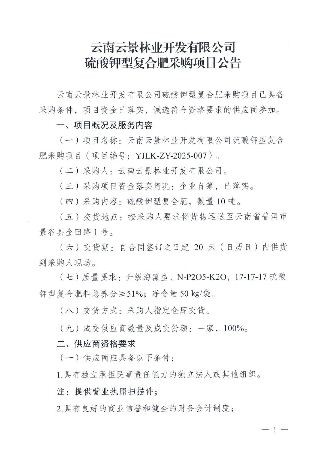 云南云景林業(yè)開發(fā)有限公司硫酸鉀型復(fù)合肥采購項目公告