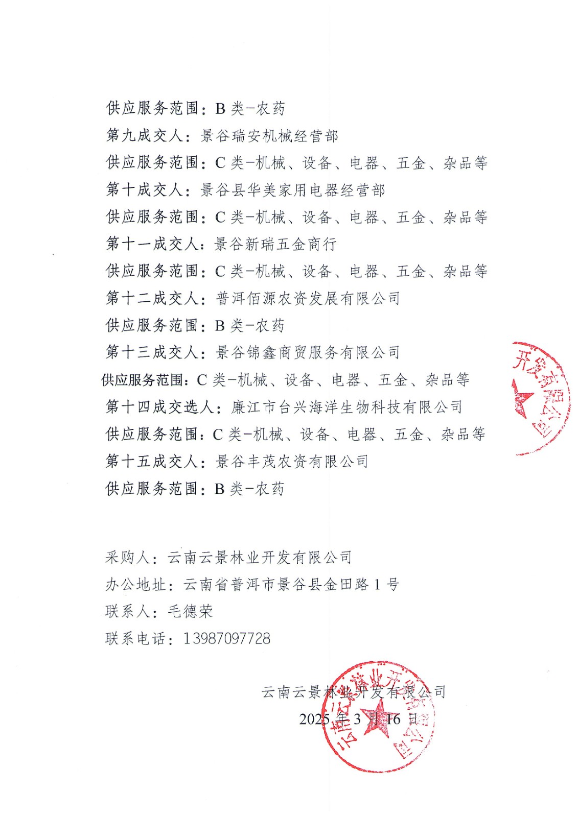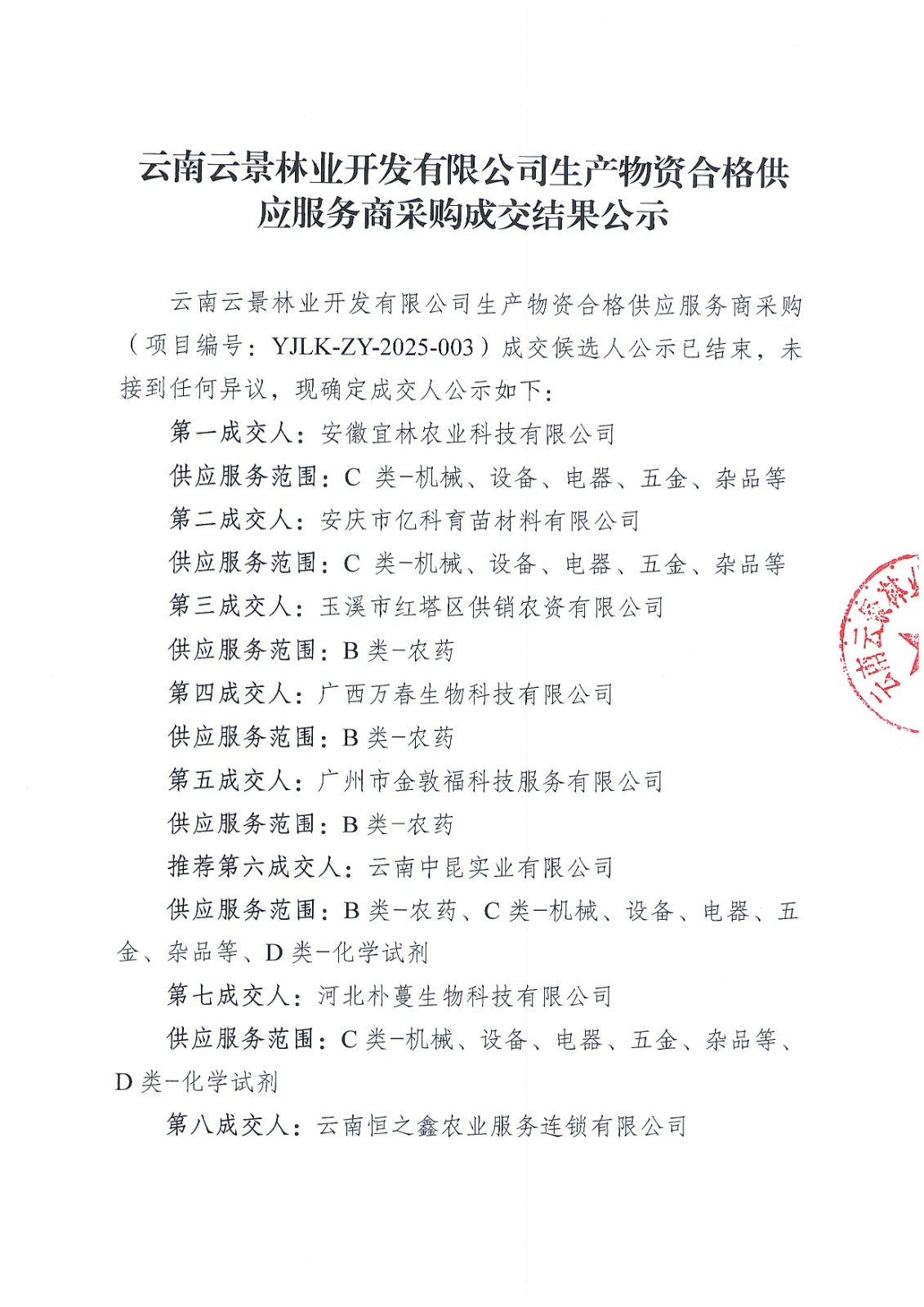 云南云景林業(yè)開發(fā)有限公司生產(chǎn)物資合格供應(yīng)服務(wù)商采購成交結(jié)果公示
