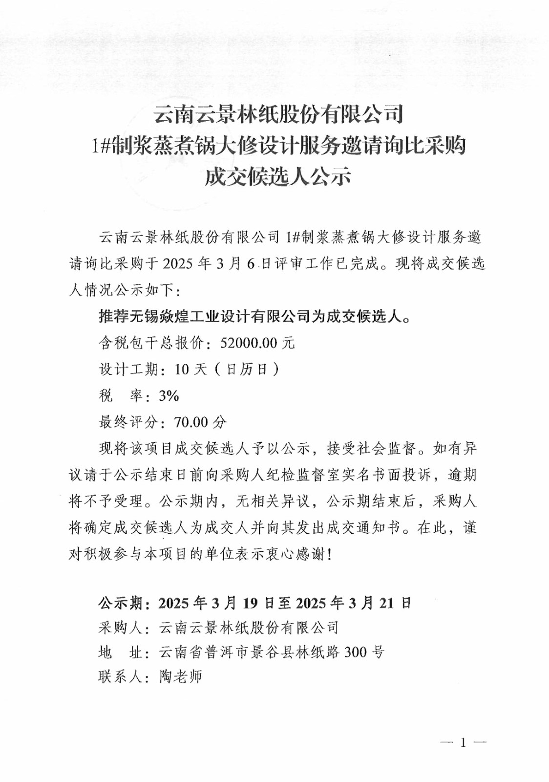 云南云景林紙股份有限公司1#制漿蒸煮鍋大修設(shè)計(jì)服務(wù)邀請(qǐng)?jiān)儽炔少彸山缓蜻x人公示