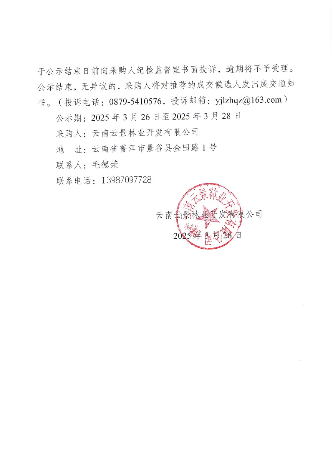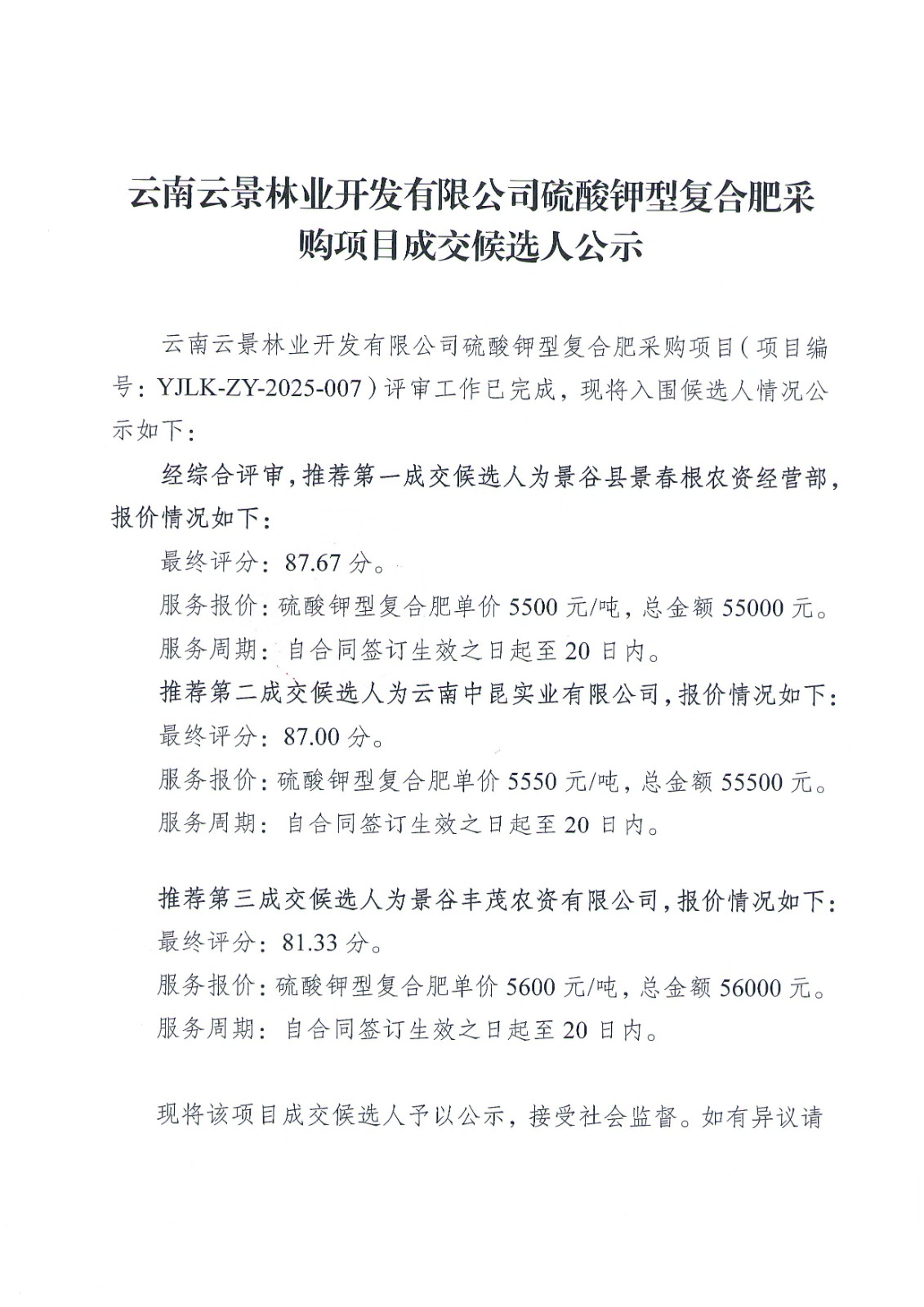 云南云景林業(yè)開發(fā)有限公司硫酸鉀型復(fù)合肥采購項目成交候選人公示