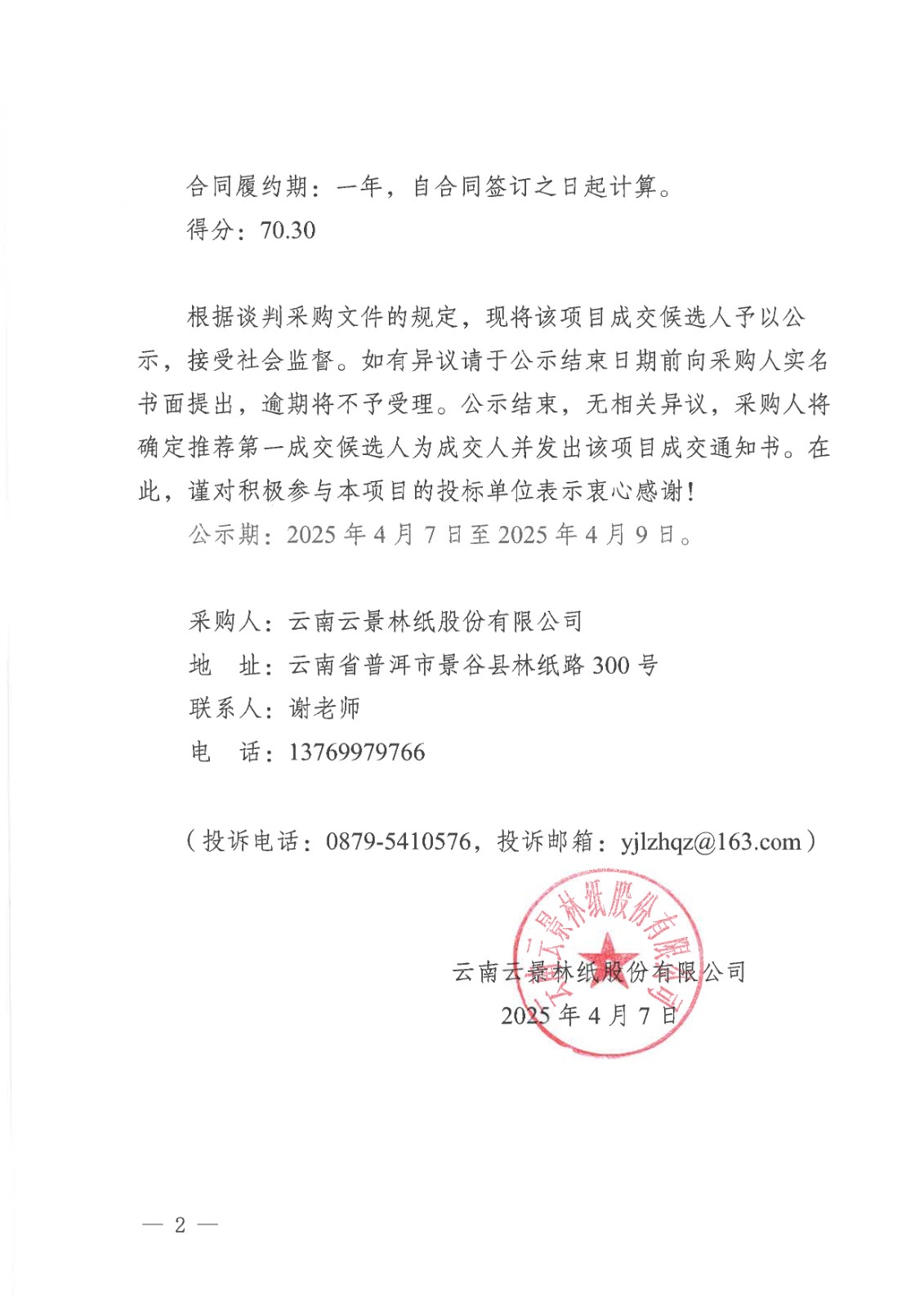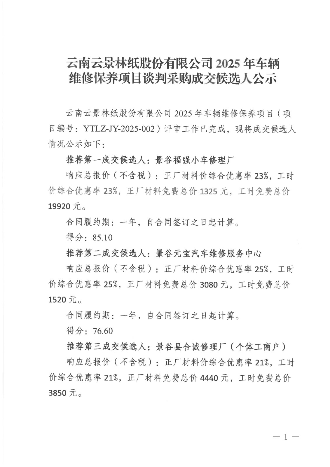 云南云景林紙股份有限公司2025年車輛維修保養(yǎng)項目談判采購成交候選人公示