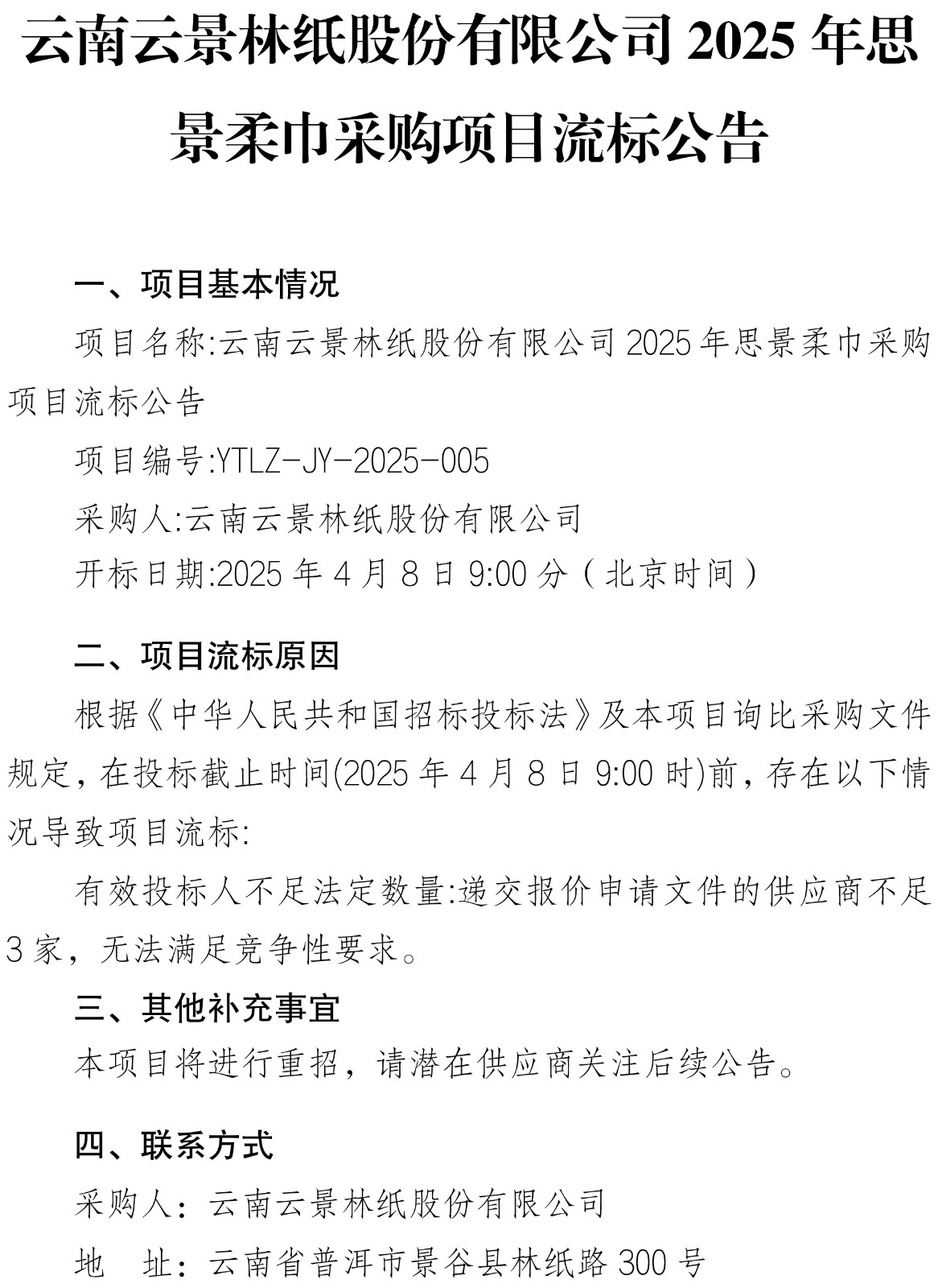 云南云景林紙股份有限公司2025年思景柔巾采購項目流標(biāo)公告
