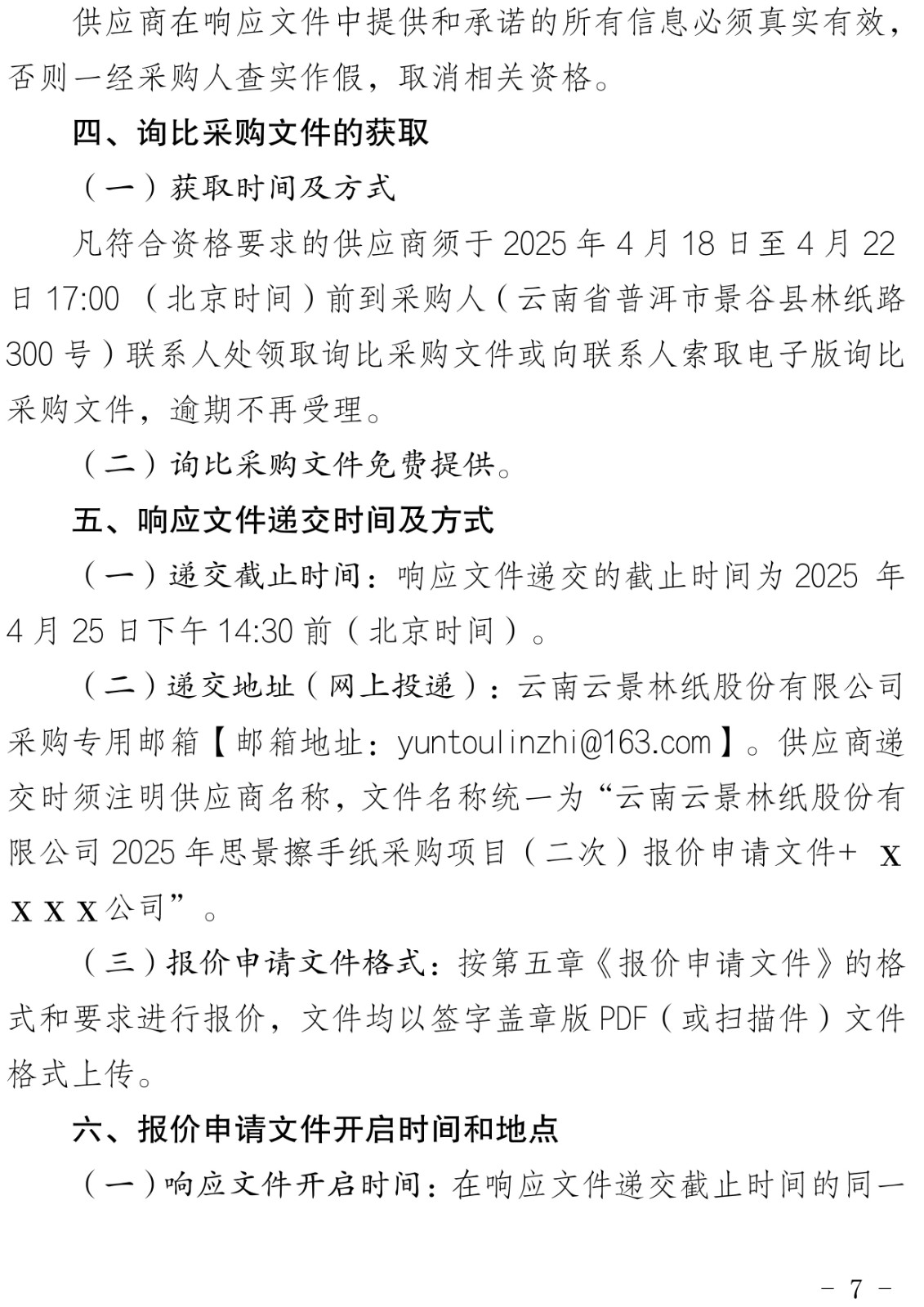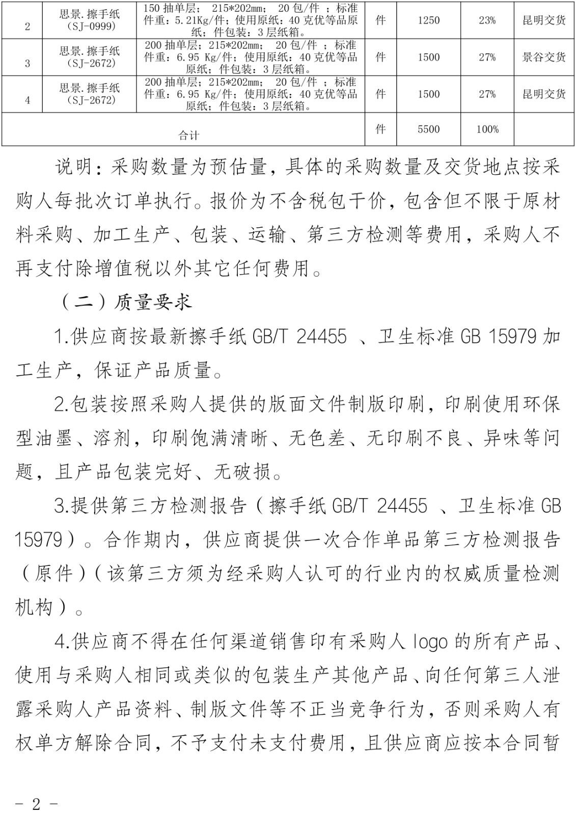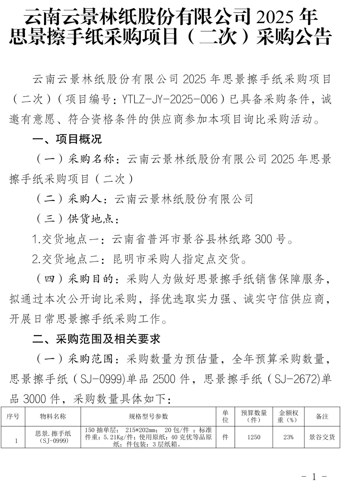 云南云景林紙股份有限公司2025年思景擦手紙采購項(xiàng)目(二次)采購公告