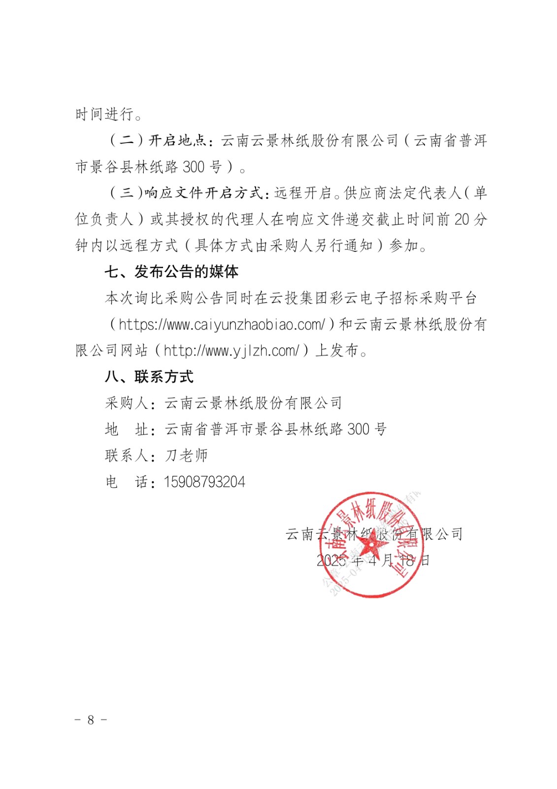 云南云景林紙股份有限公司2025年思景盤紙采購項(xiàng)目(二次)采購公告