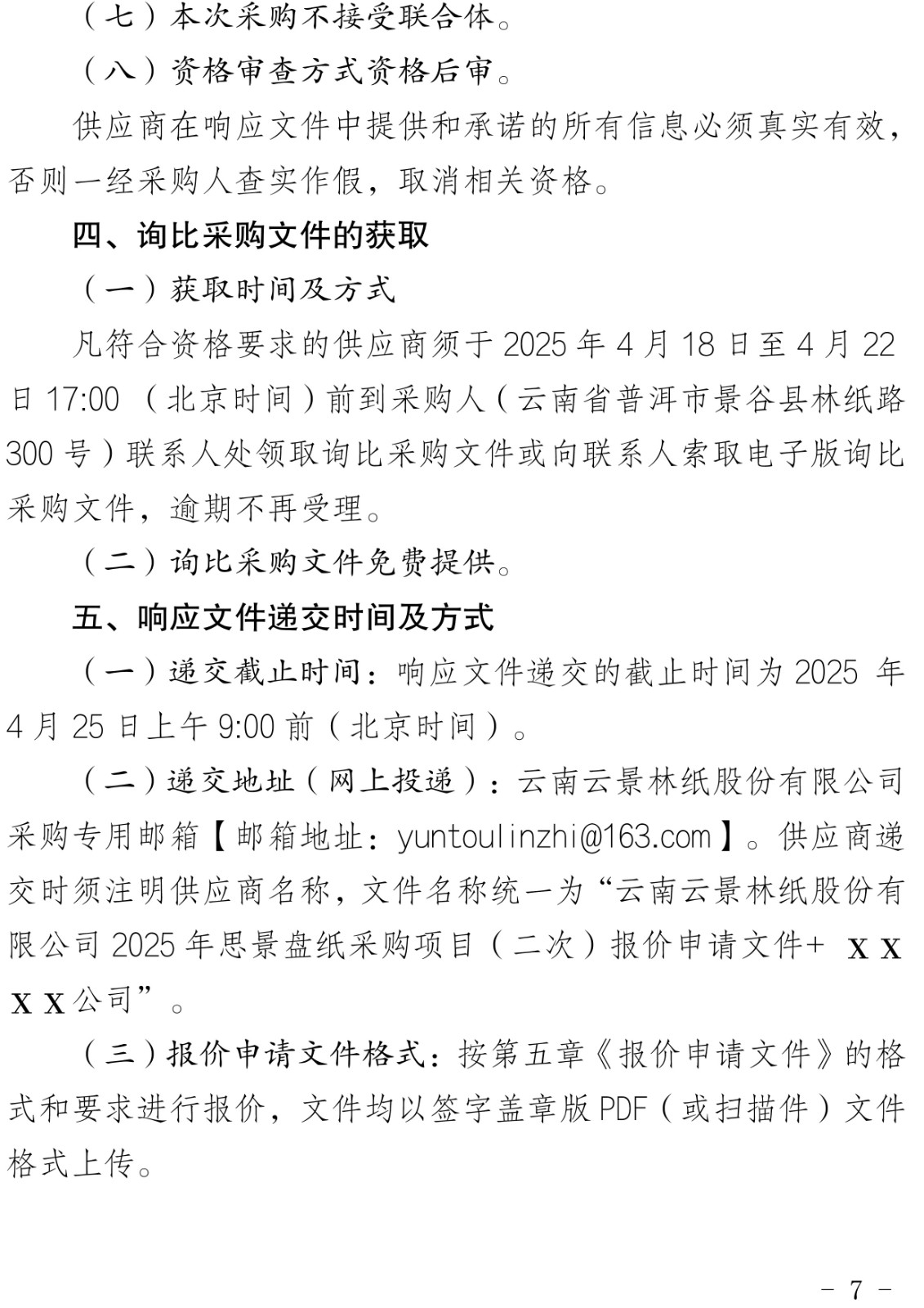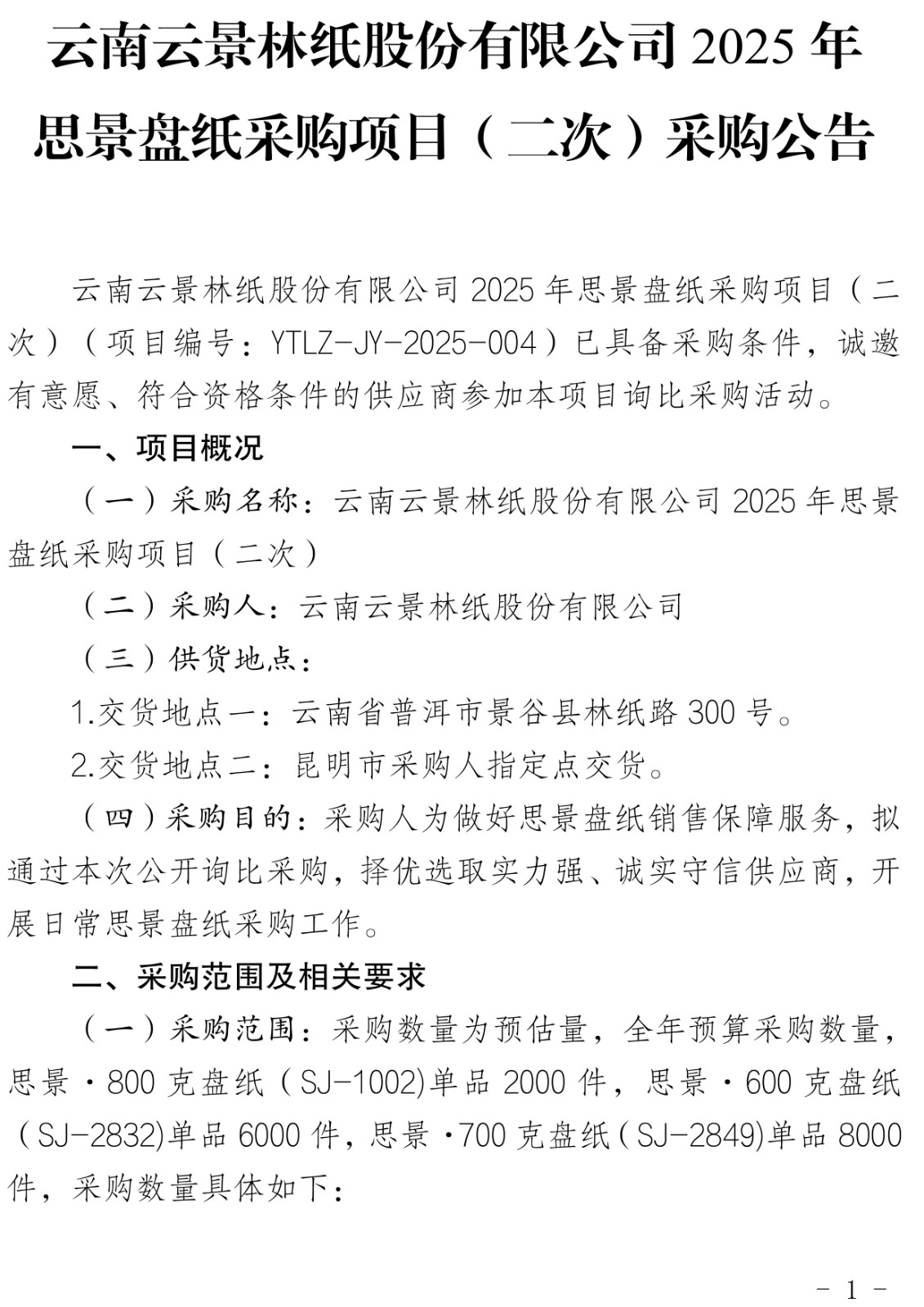 云南云景林紙股份有限公司2025年思景盤紙采購項目(二次)采購公告
