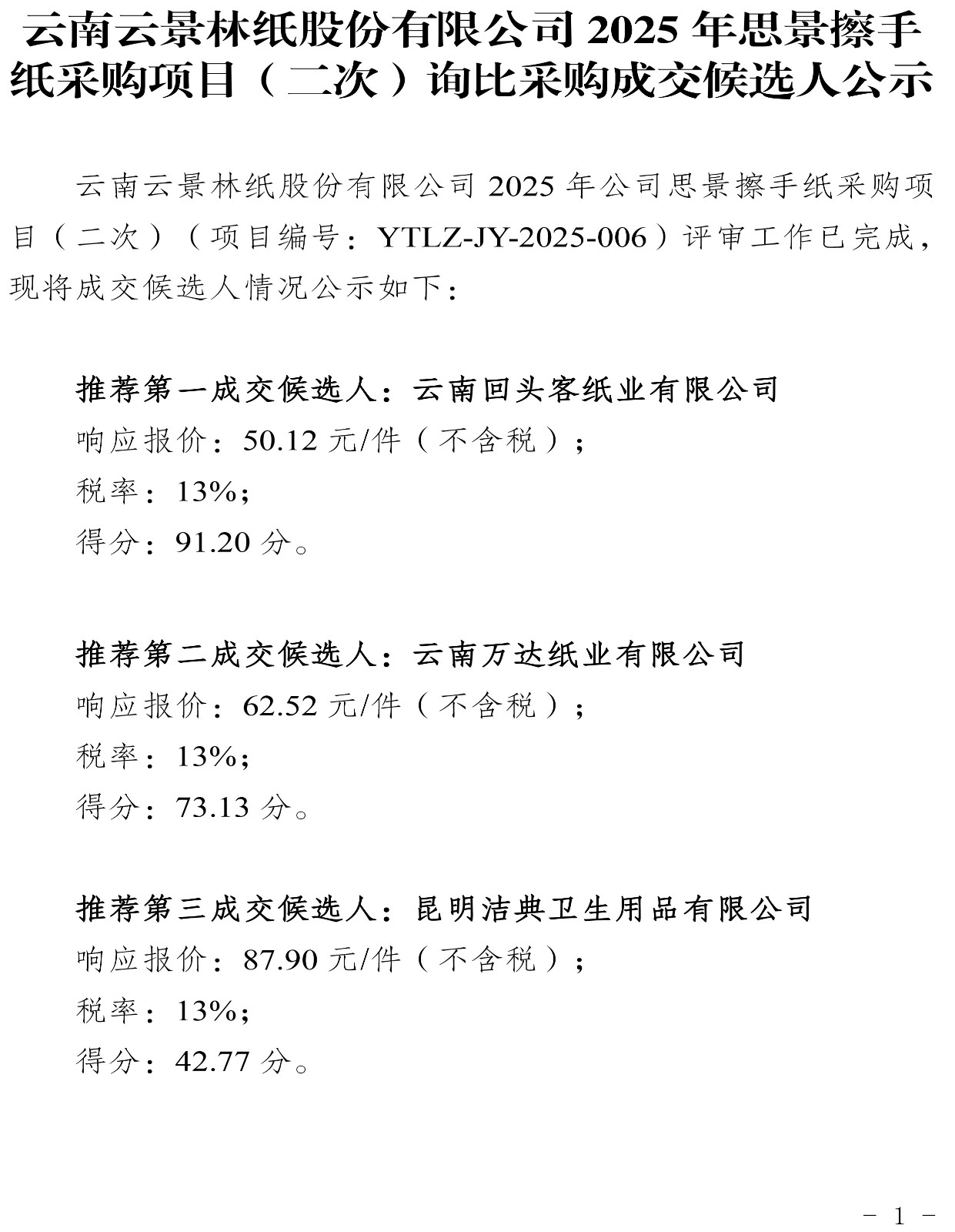 云南云景林紙股份有限公司2025年思景擦手紙采購(gòu)項(xiàng)目(二次)詢比采購(gòu)成交候選人公示