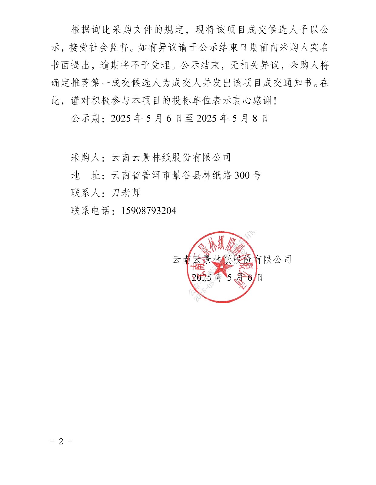 云南云景林紙股份有限公司2025年思景盤紙采購(gòu)項(xiàng)目(二次)詢比采購(gòu)成交候選人公示