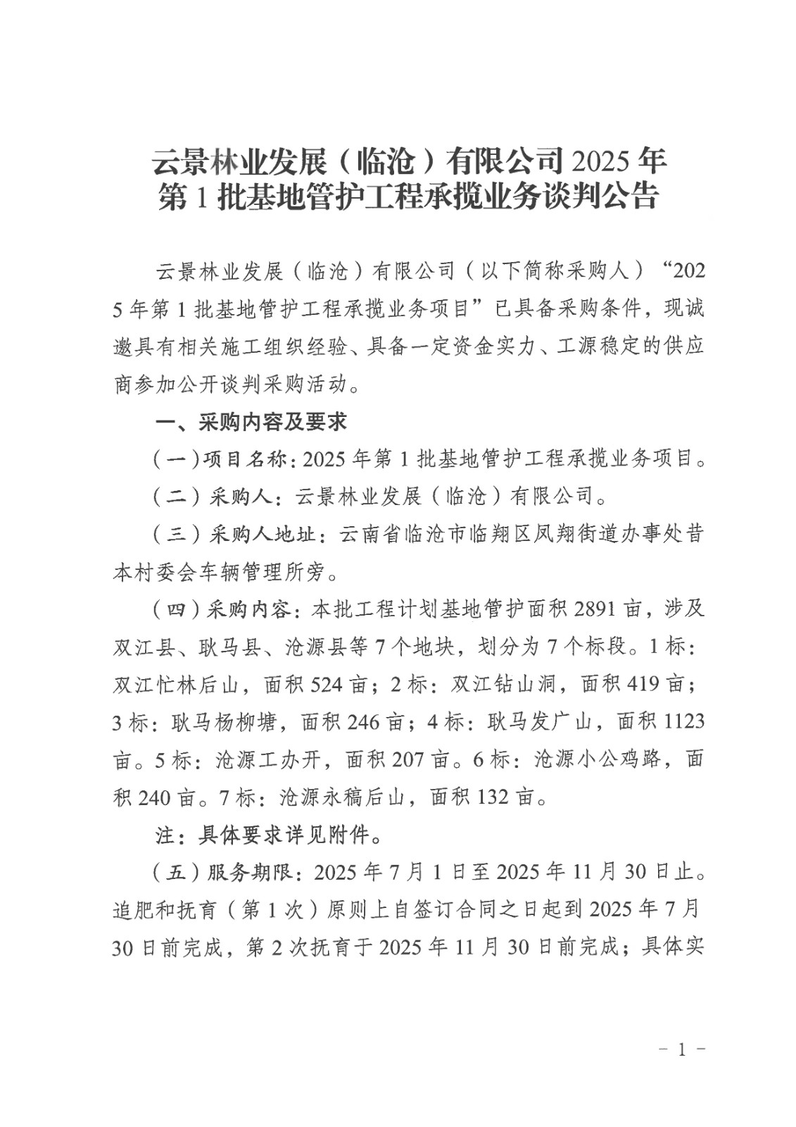 云景林業(yè)發(fā)展(臨滄)有限公司2025年第1批基地管護(hù)工程承攬業(yè)務(wù)談判公告