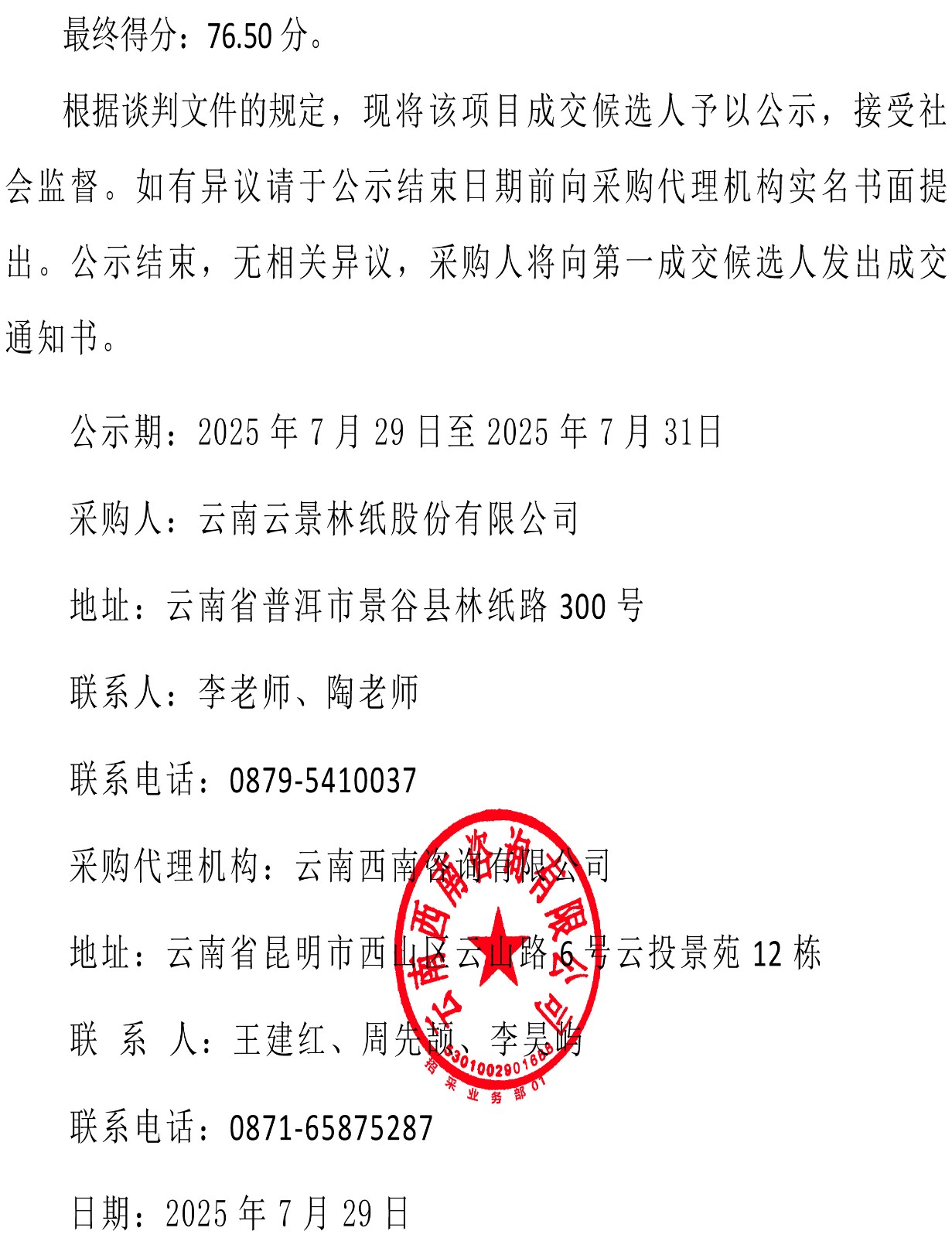 云南云景林紙股份有限公司2025年零星玻璃鋼修理業(yè)務(wù)外包成交候選人公示
