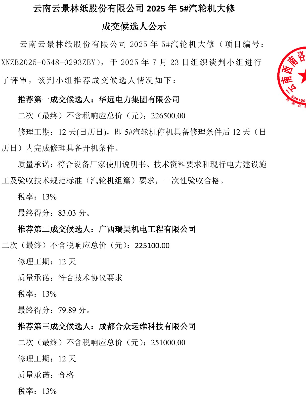 云南云景林紙股份有限公司2025年5#汽輪機(jī)大修成交候選人公示