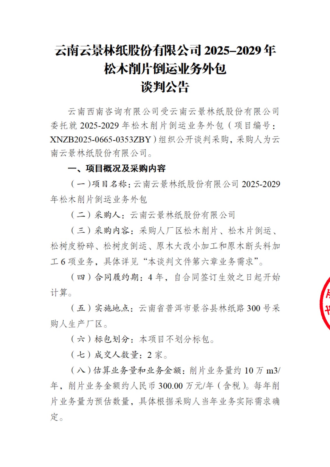 云南云景林紙股份有限公司2025-2029年松木削片倒運(yùn)業(yè)務(wù)外包談判公告