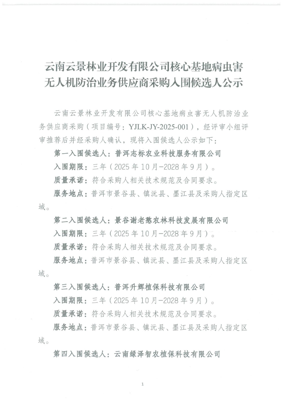 云南云景林業(yè)開(kāi)發(fā)有限公司核心基地病蟲(chóng)害無(wú)人機(jī)防治業(yè)務(wù)供應(yīng)商采購(gòu)人圍候選人公示