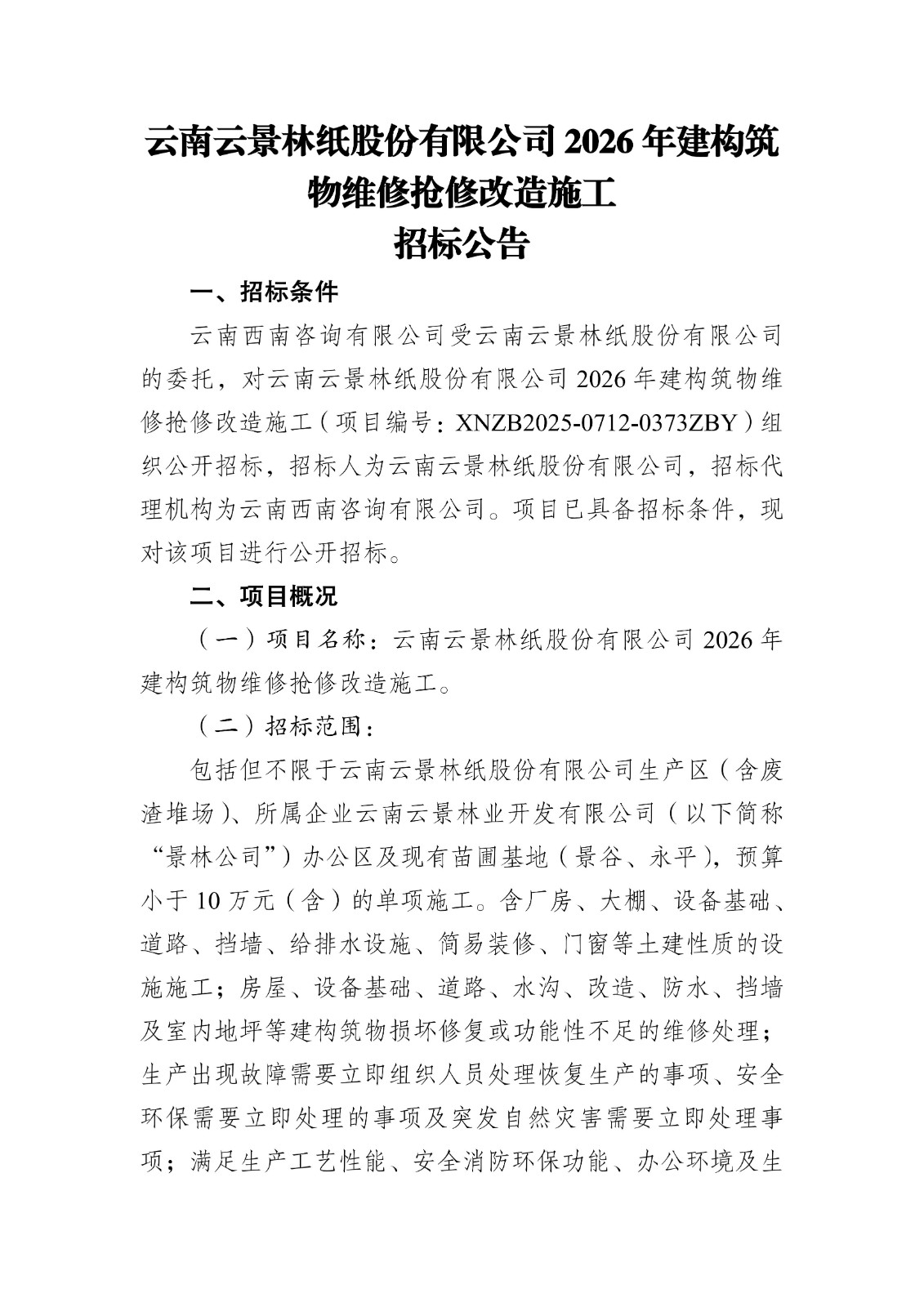 云南云景林紙股份有限公司2026年建構筑物維修搶修改造施工招標公告