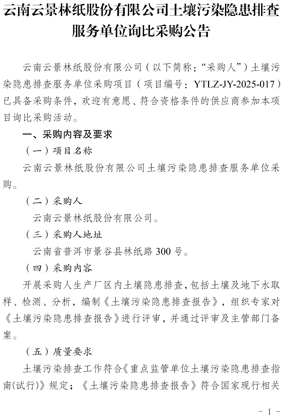 云南云景林紙股份有限公司土壤污染隱患排查服務單位詢比采購公告