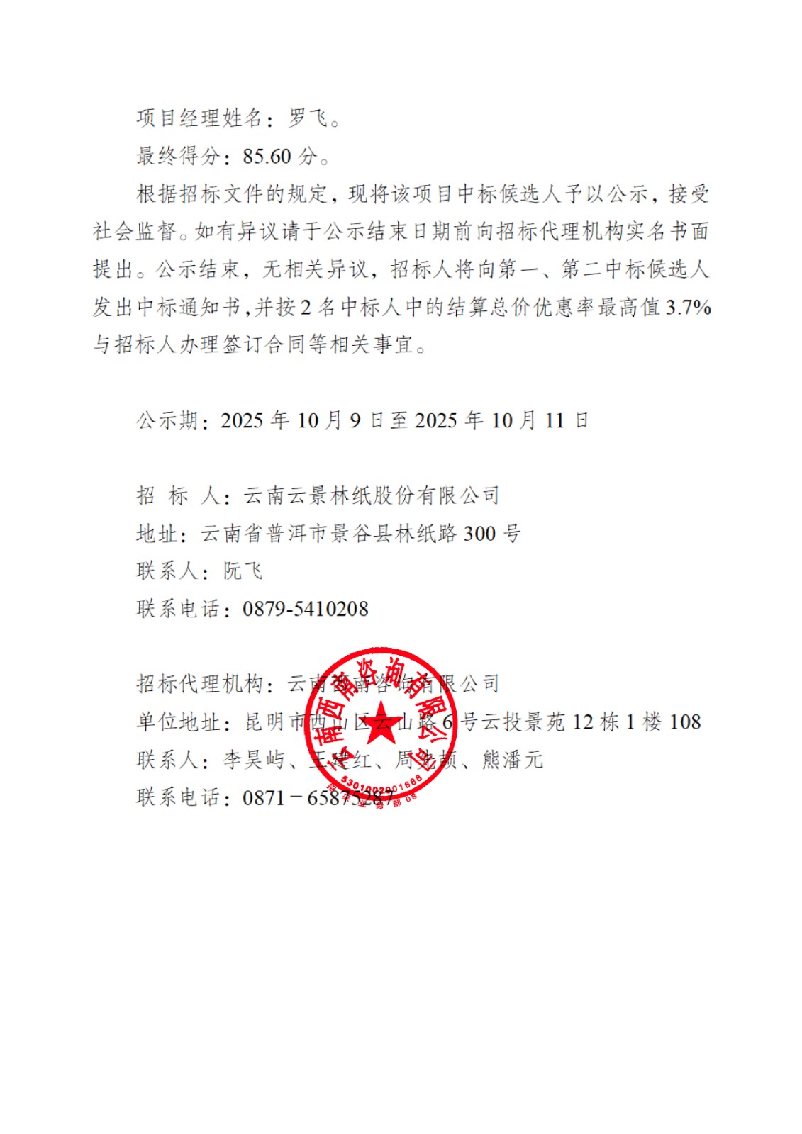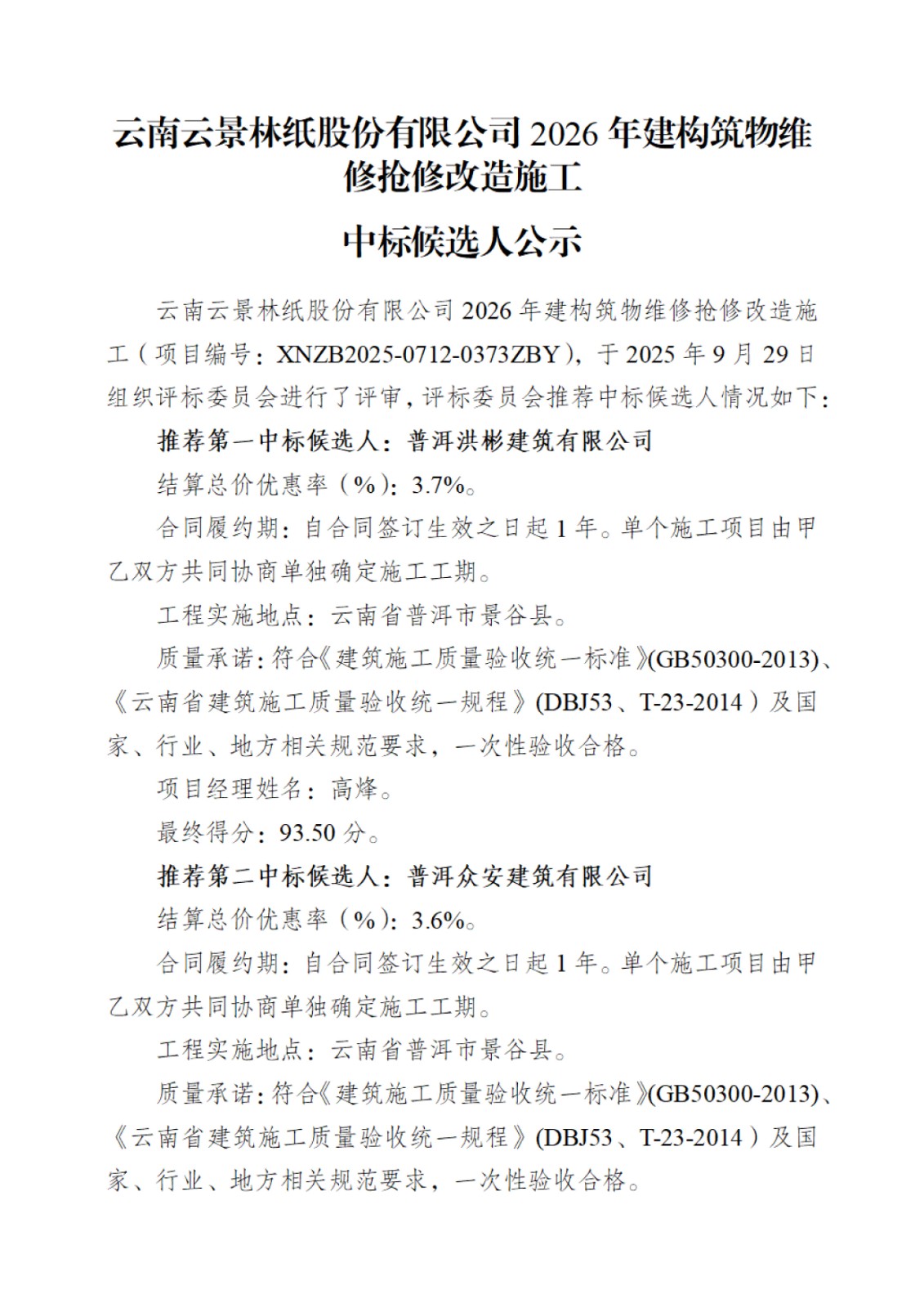 云南云景林紙股份有限公司2026年建構(gòu)筑物維修搶修改造施工中標(biāo)候選人公示