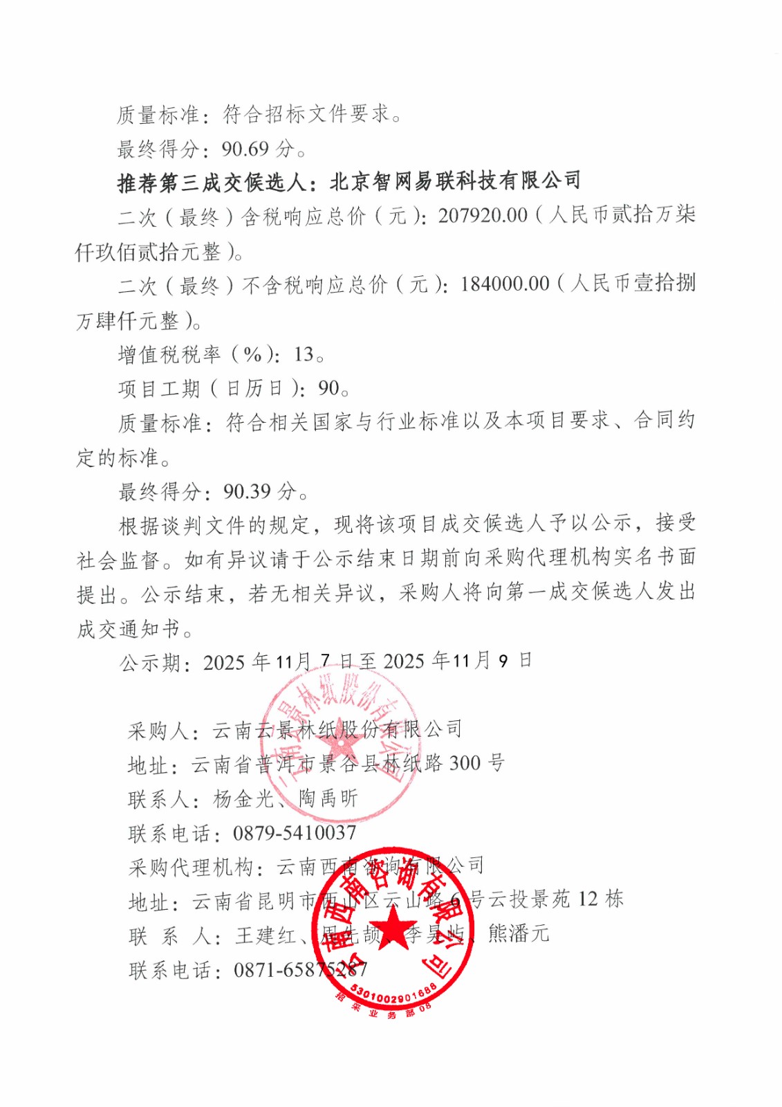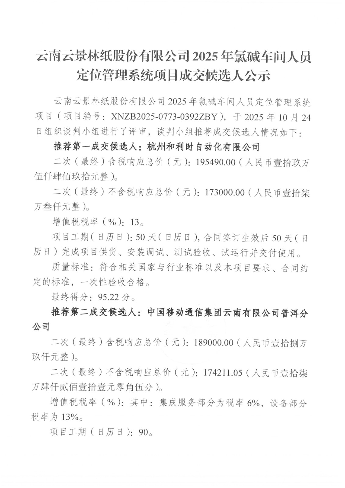 云南云景林紙股份有限公司2025年氯堿車(chē)間人員定位管理系統(tǒng)項(xiàng)目成交候選人公示