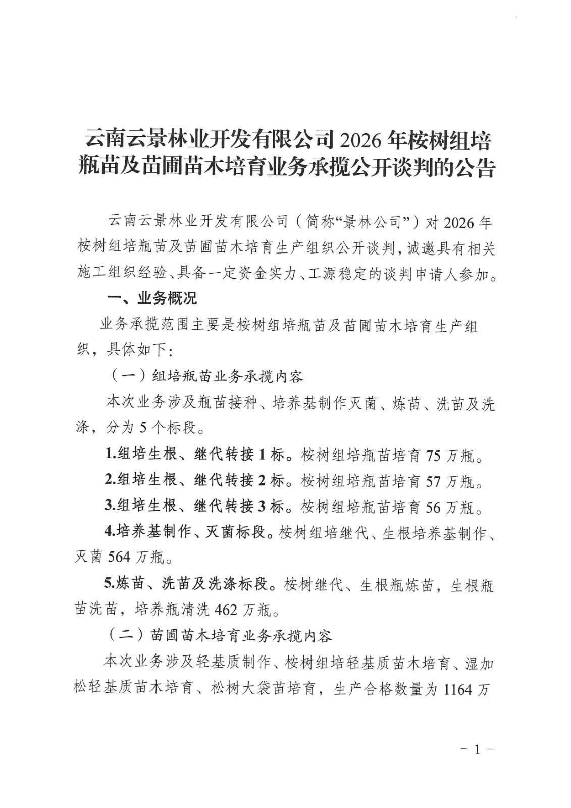 云南云景林業(yè)開發(fā)有限公司2026年桉樹組培瓶苗及苗圃苗木培育業(yè)務(wù)承攬公開談判的公告