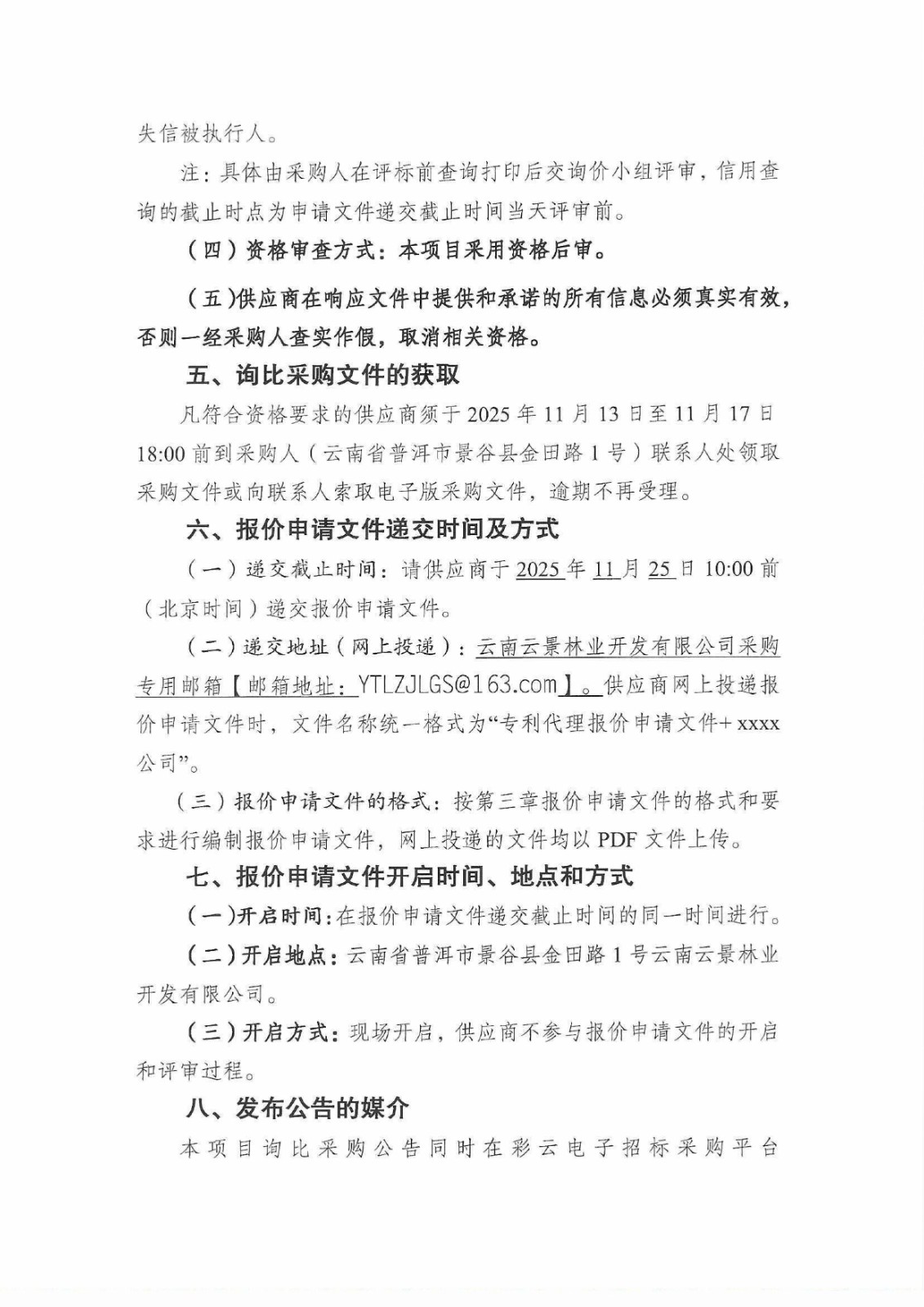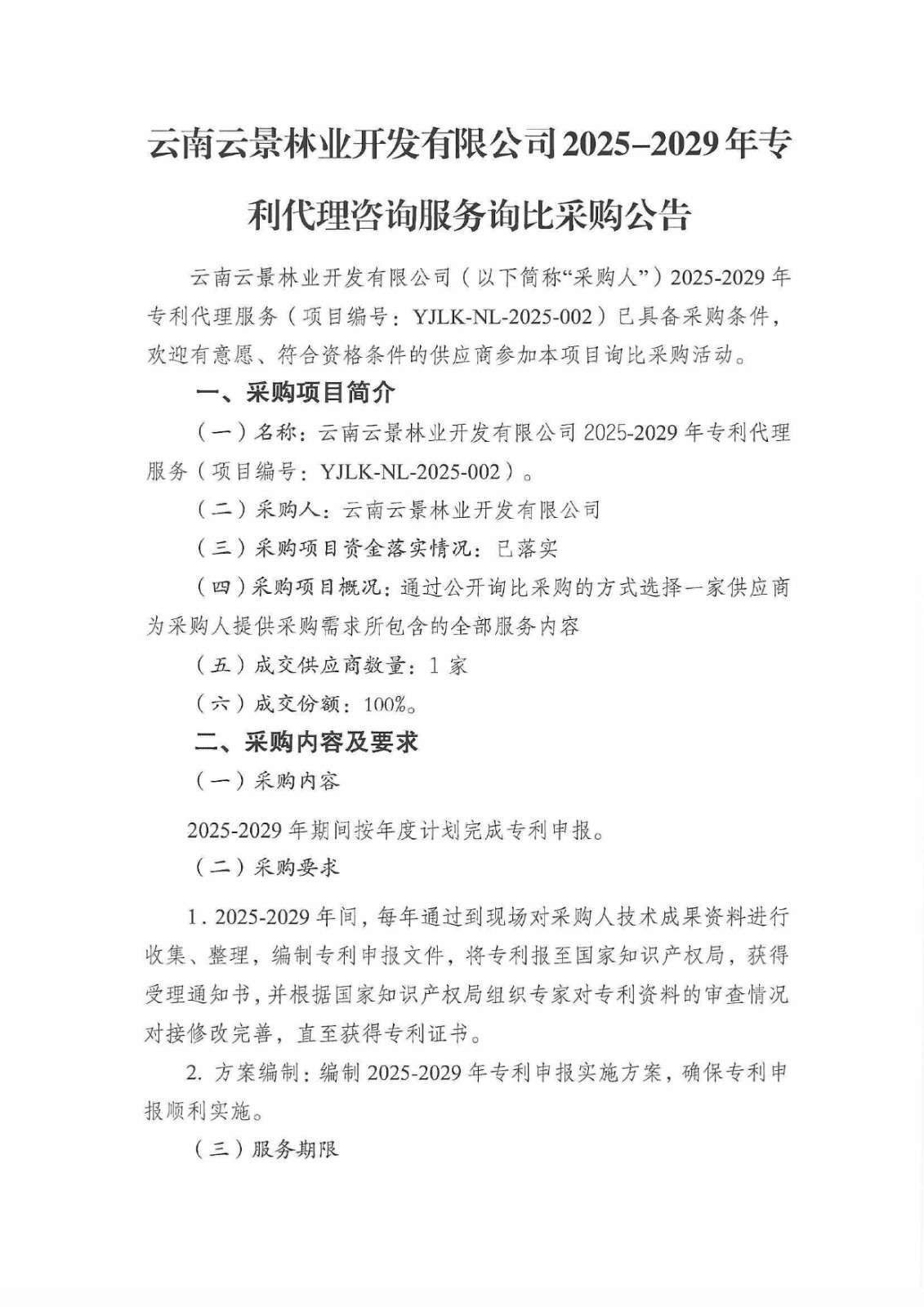 云南云景林業(yè)開(kāi)發(fā)有限公司2025-2029年專(zhuān)利代理咨詢(xún)服務(wù)詢(xún)比采購(gòu)公告