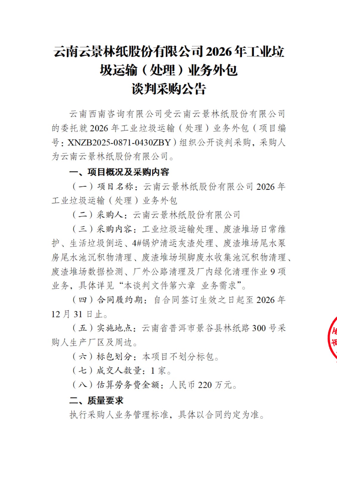云南云景林紙股份有限公司2026年工業(yè)垃圾運輸(處理)業(yè)務(wù)外包談判采購公告