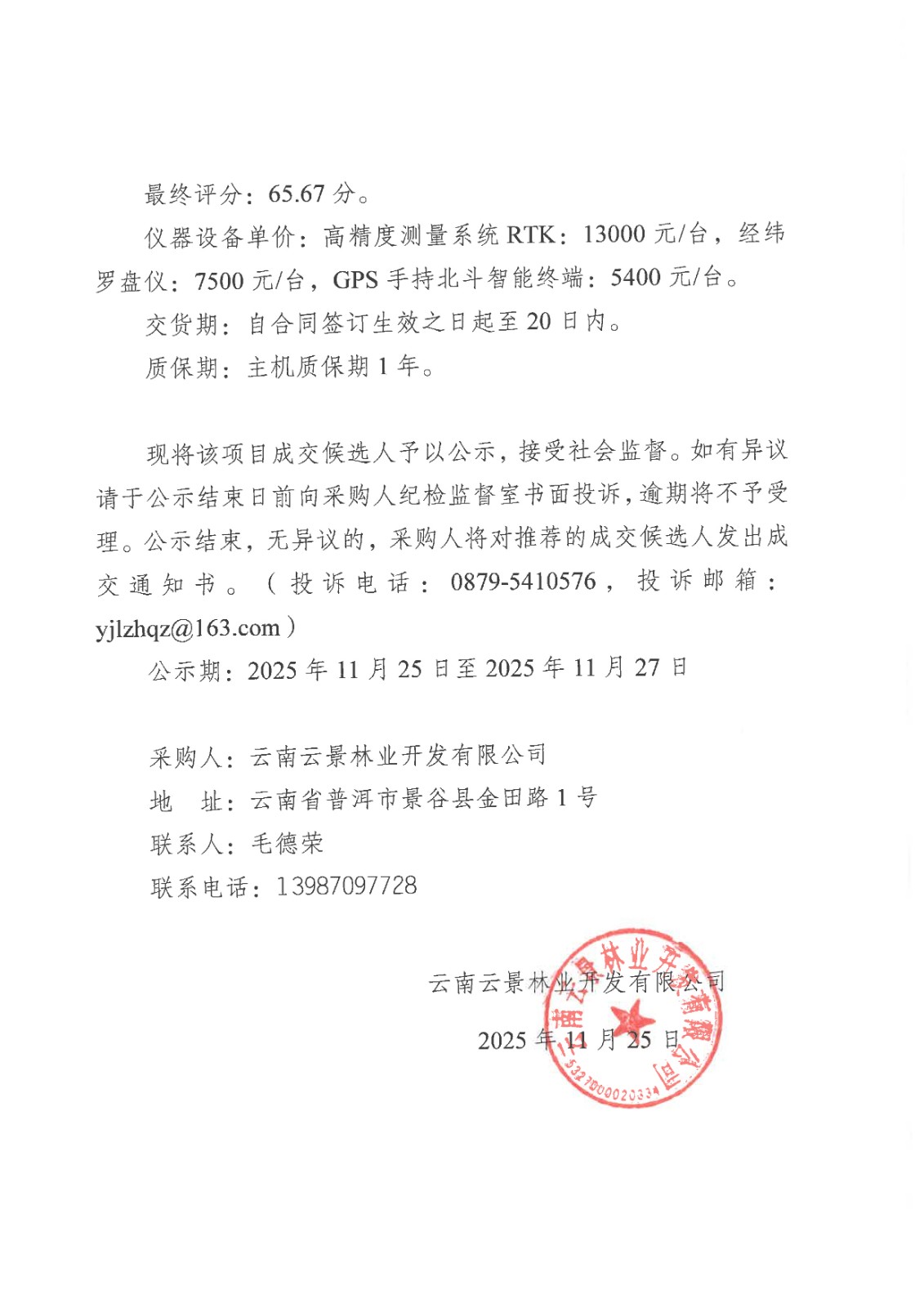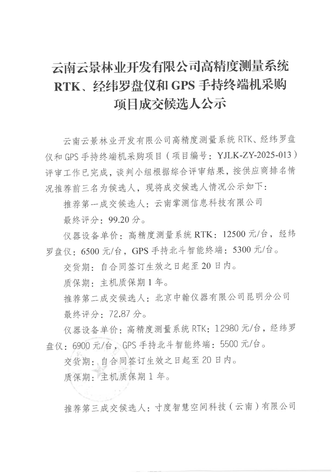 云南云景林業(yè)開發(fā)有限公司高精度測量系統(tǒng)RTK、經(jīng)緯羅盤儀和GPS手持終端機(jī)采購項目成交候選人公示