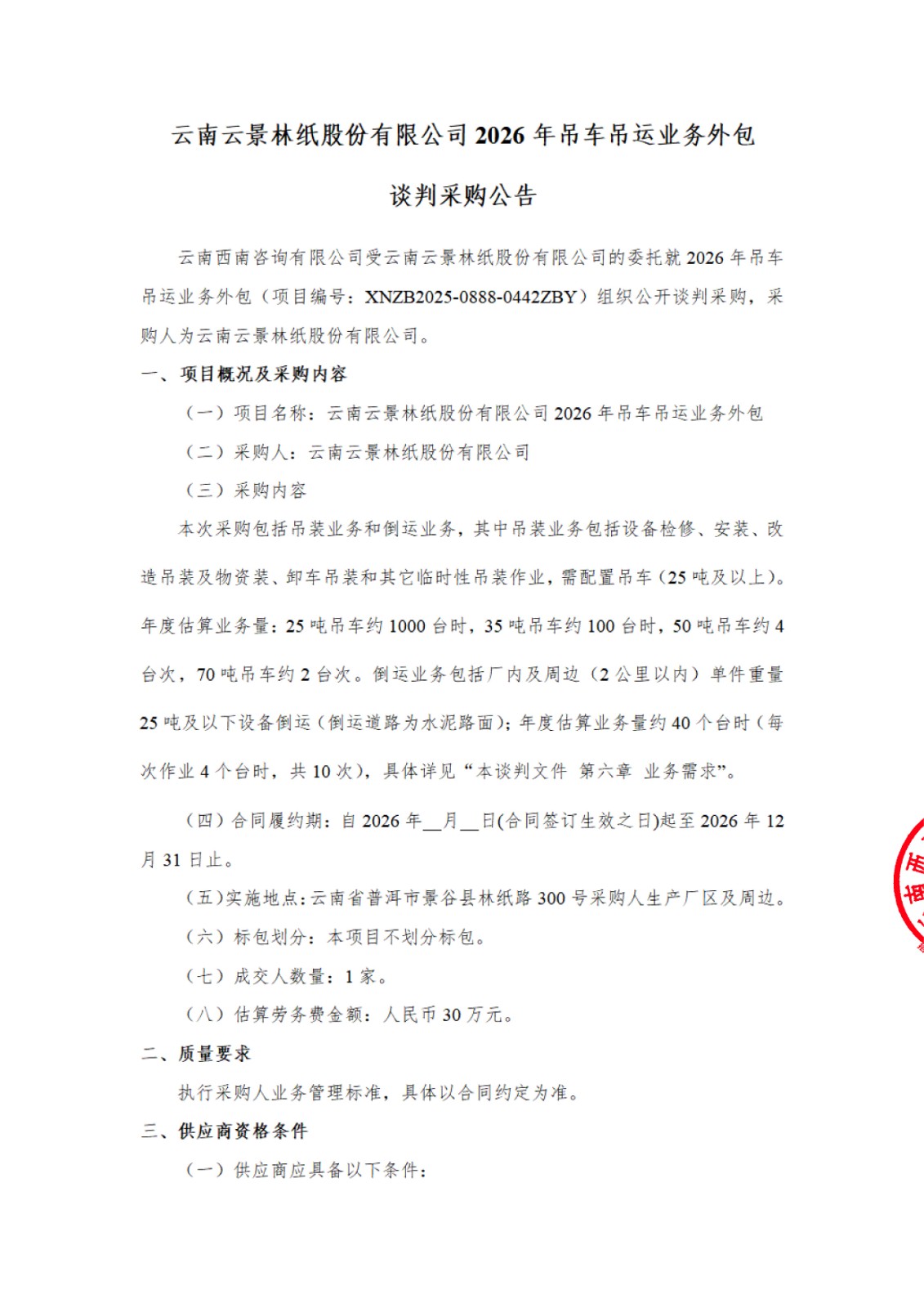 云南云景林紙股份有限公司2026年吊車吊運業(yè)務(wù)外包談判采購公告