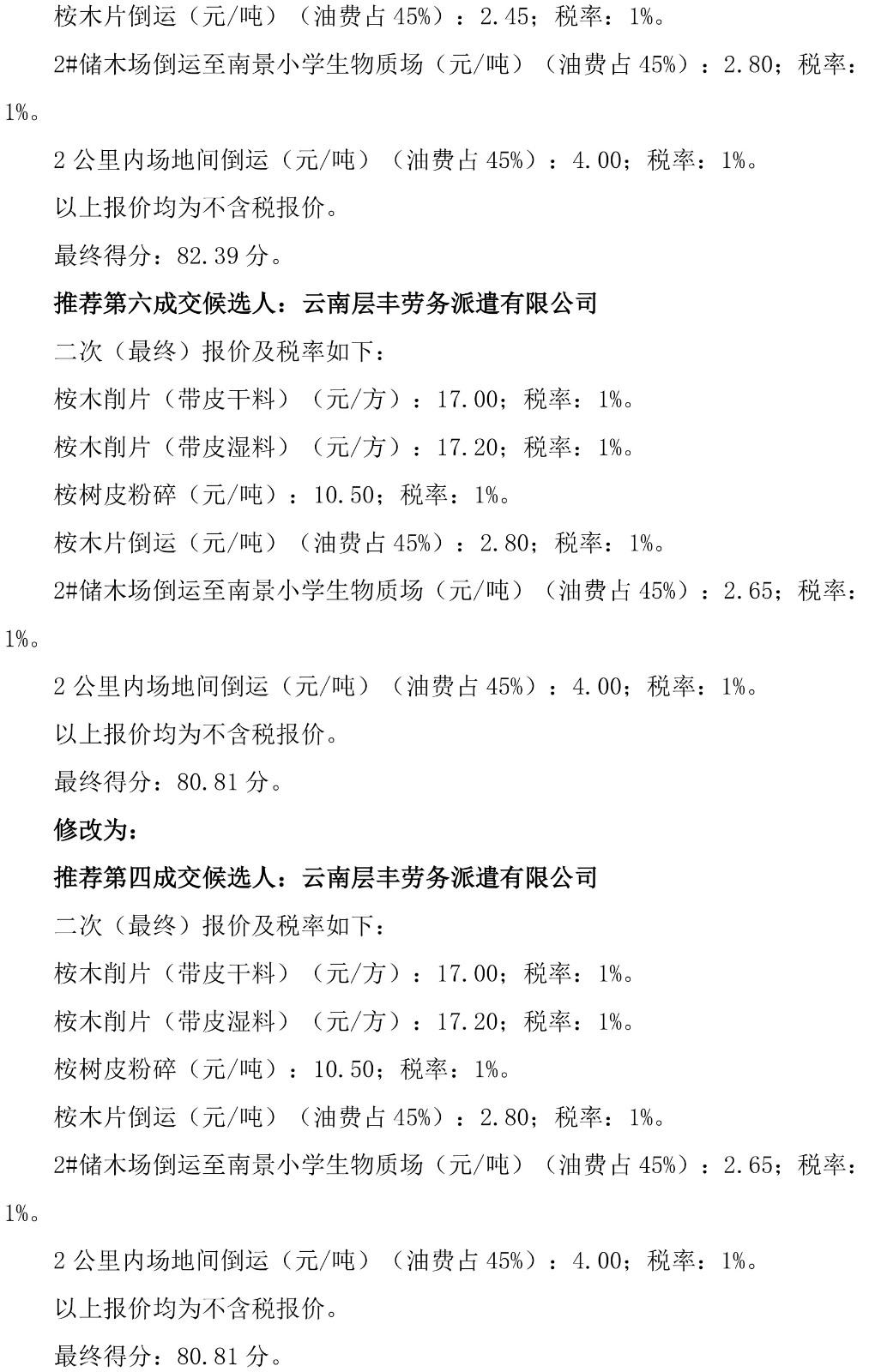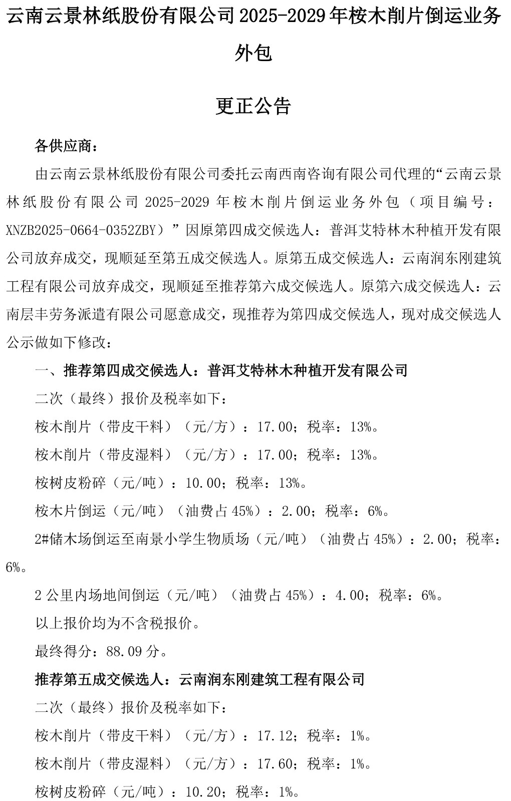 云南云景林紙股份有限公司2025-2029年按木削片倒運(yùn)業(yè)務(wù)外包更正公告