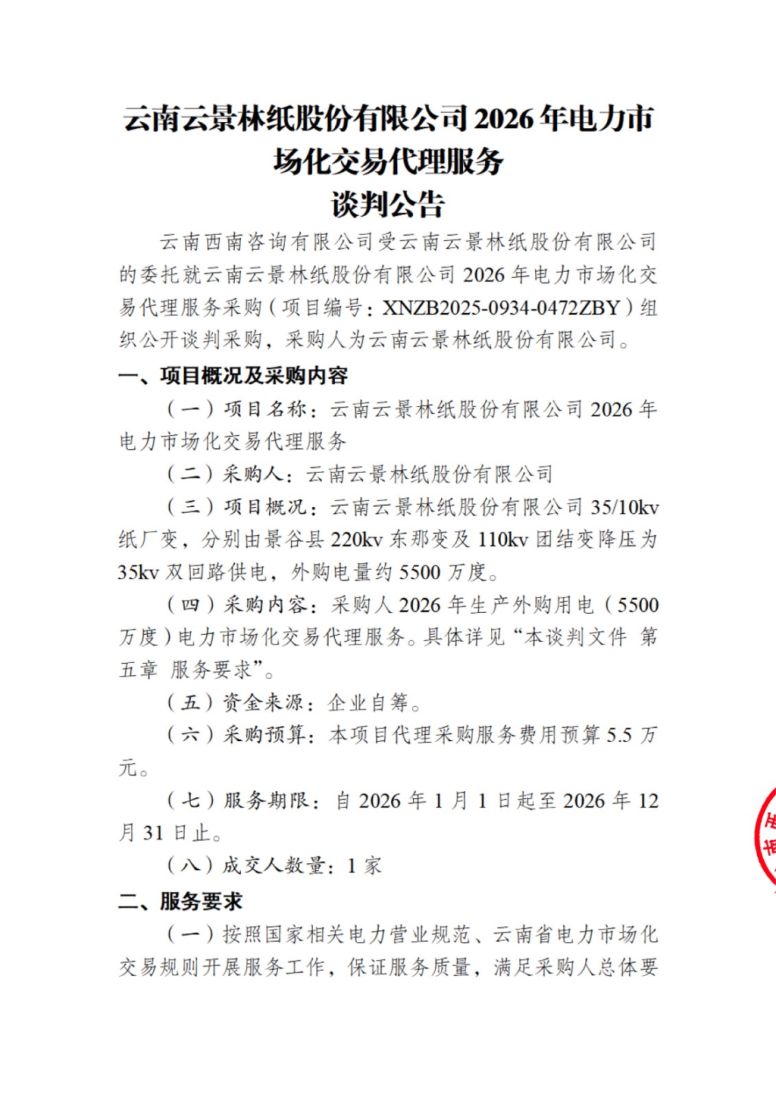 云南云景林紙股份有限公司2026年電力市場化交易代理服務(wù)談判公告