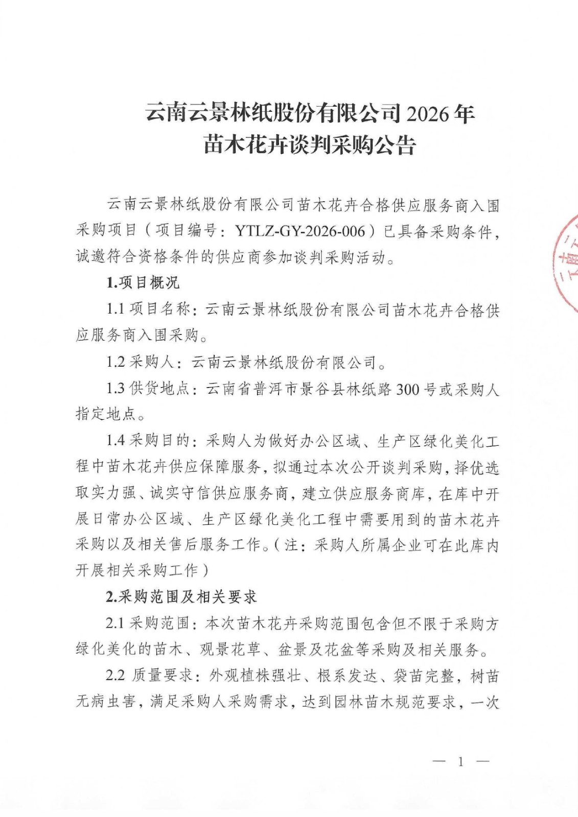 云南云景林紙股份有限公司2026年苗木花卉談判采購公告