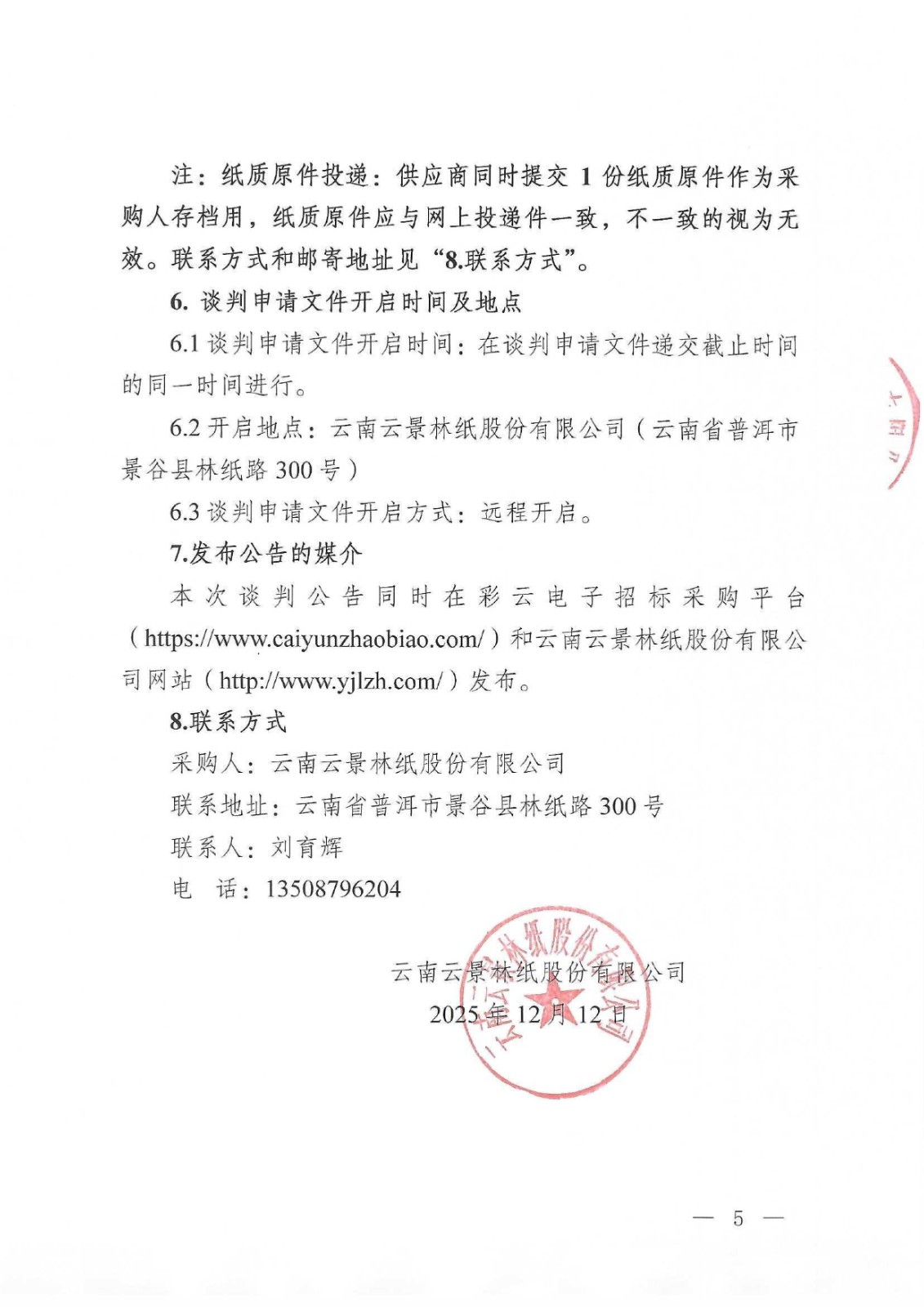 云南云景林紙股份有限公司2026年委托白泥綜合利用處置服務談判公告