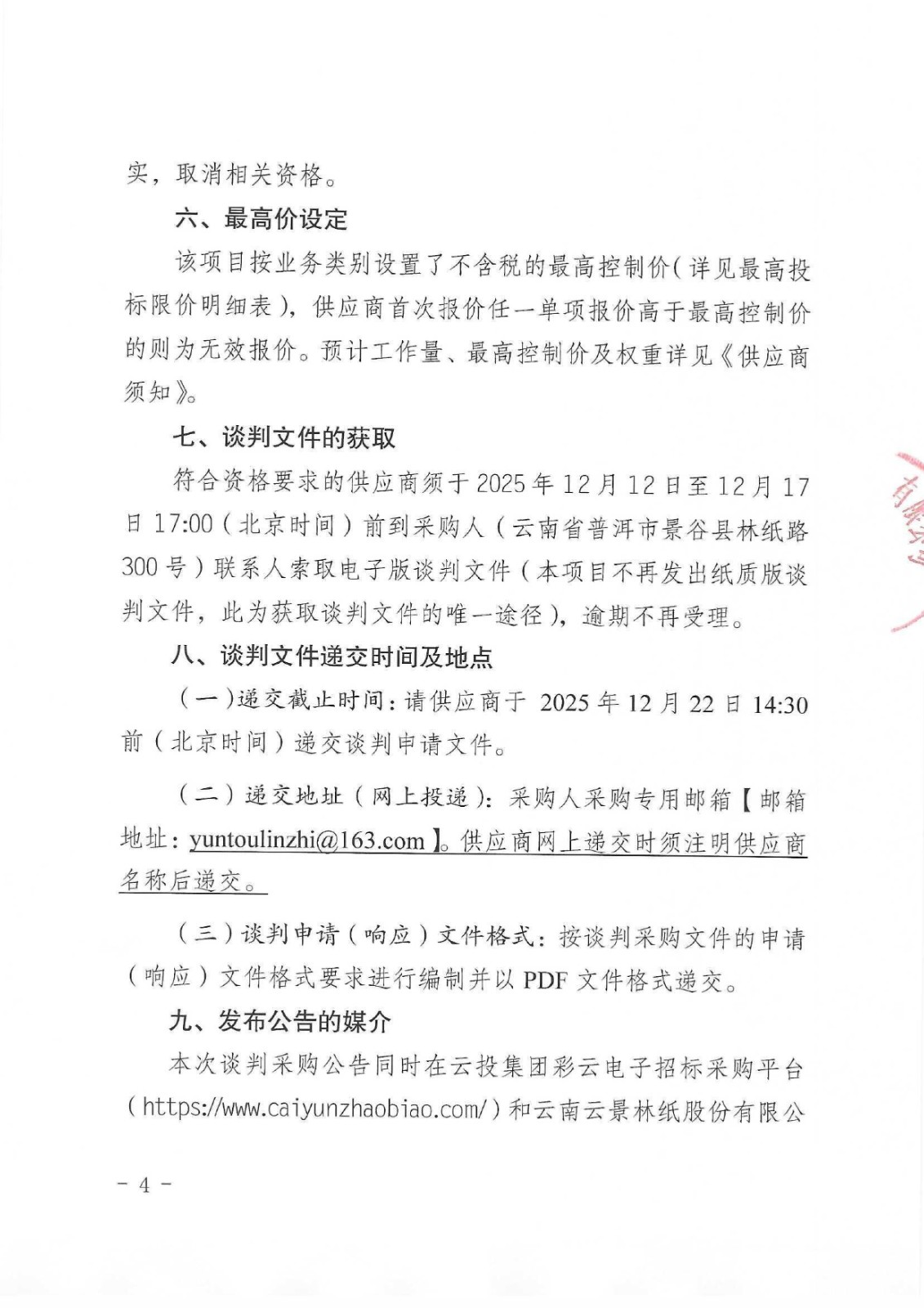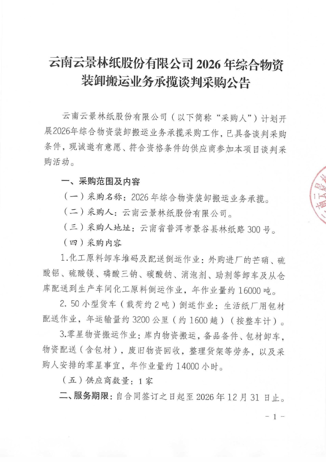 云南云景林紙股份有限公司2026年綜合物資裝卸搬運(yùn)業(yè)務(wù)承攬談判采購(gòu)公告