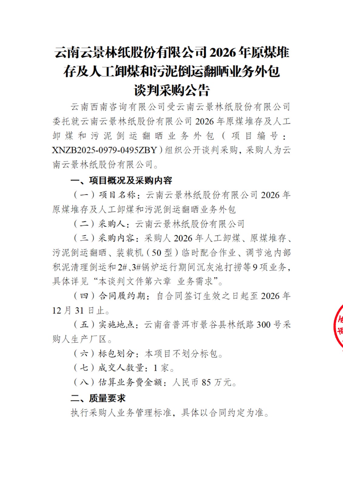 云南云景林紙股份有限公司2026年原煤堆存及人工卸煤和污泥倒運翻曬業(yè)務(wù)外包談判采購公告