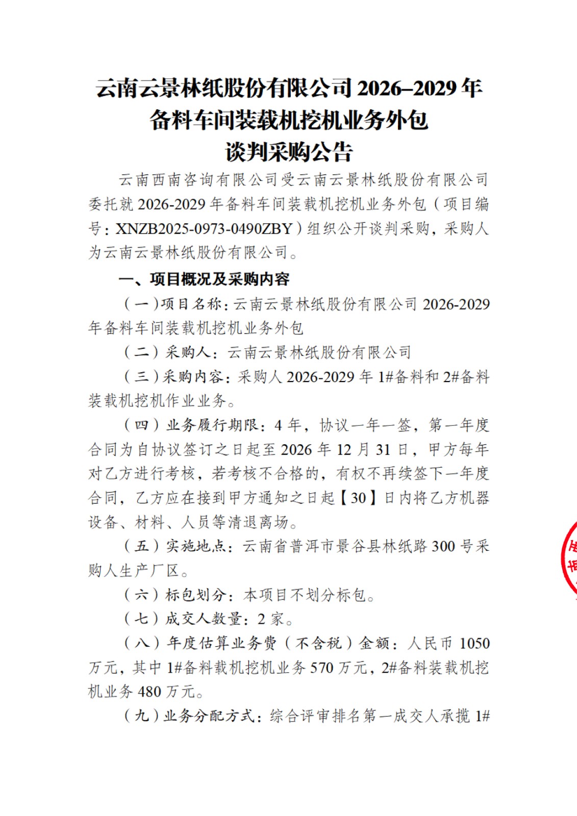 云南云景林紙股份有限公司2026-2029年備料車間裝載機(jī)挖機(jī)業(yè)務(wù)外包談判采購公告