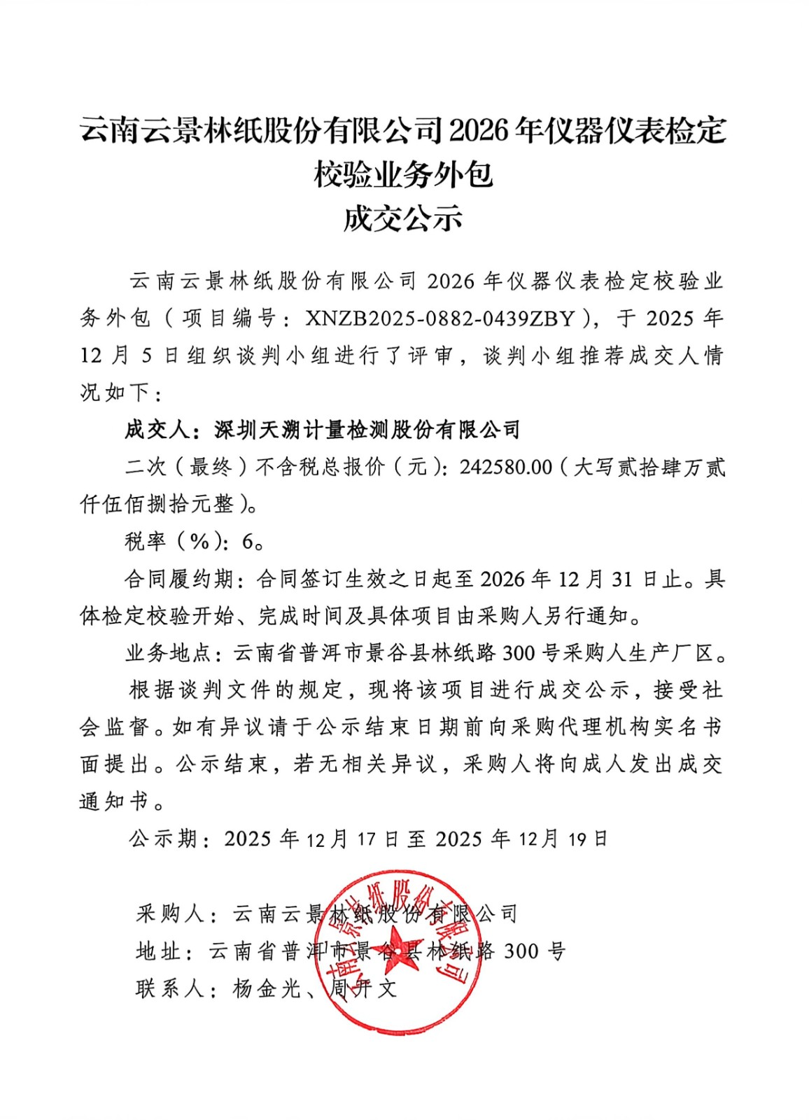 云南云景林紙股份有限公司2026年儀器儀表檢定校驗(yàn)業(yè)務(wù)外包成交公示