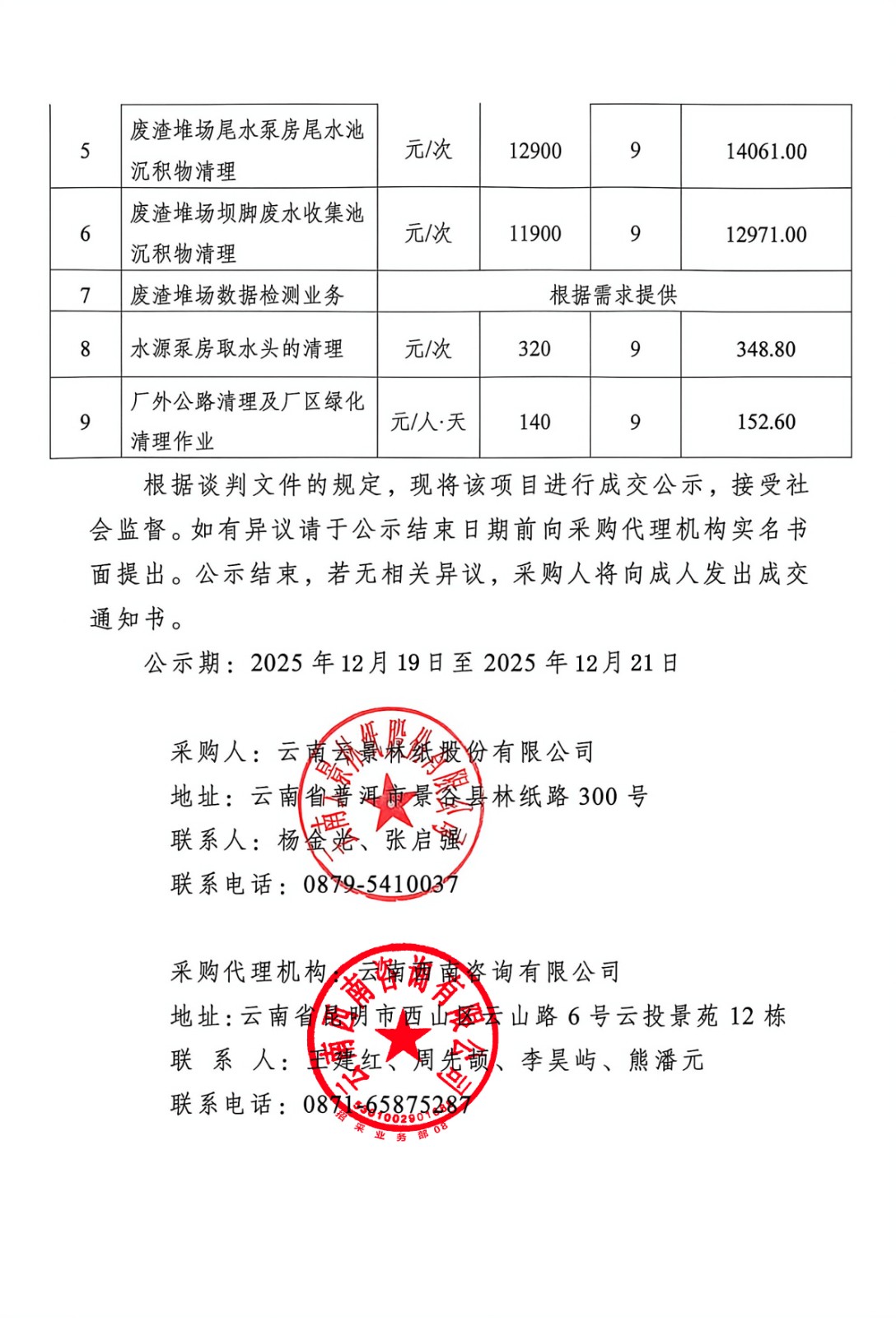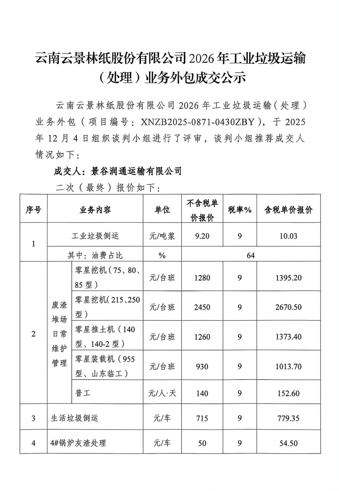 云南云景林紙股份有限公司2026年工業(yè)垃圾運(yùn)輸(處理)業(yè)務(wù)外包成交公示
