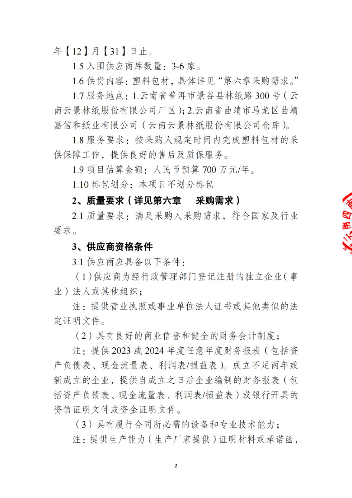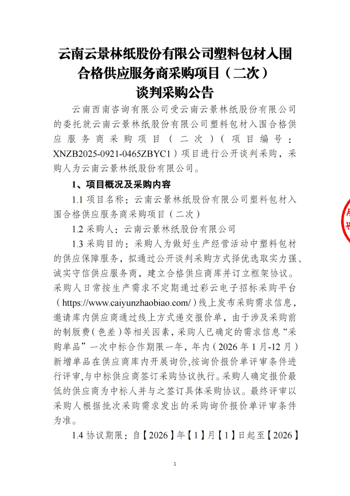云南云景林紙股份有限公司塑料包材人圍合格供應(yīng)服務(wù)商采購項目(二次)談判采購公告