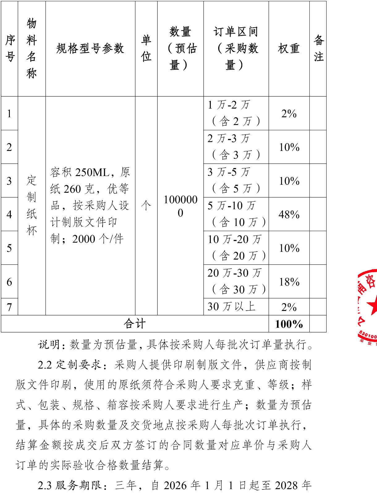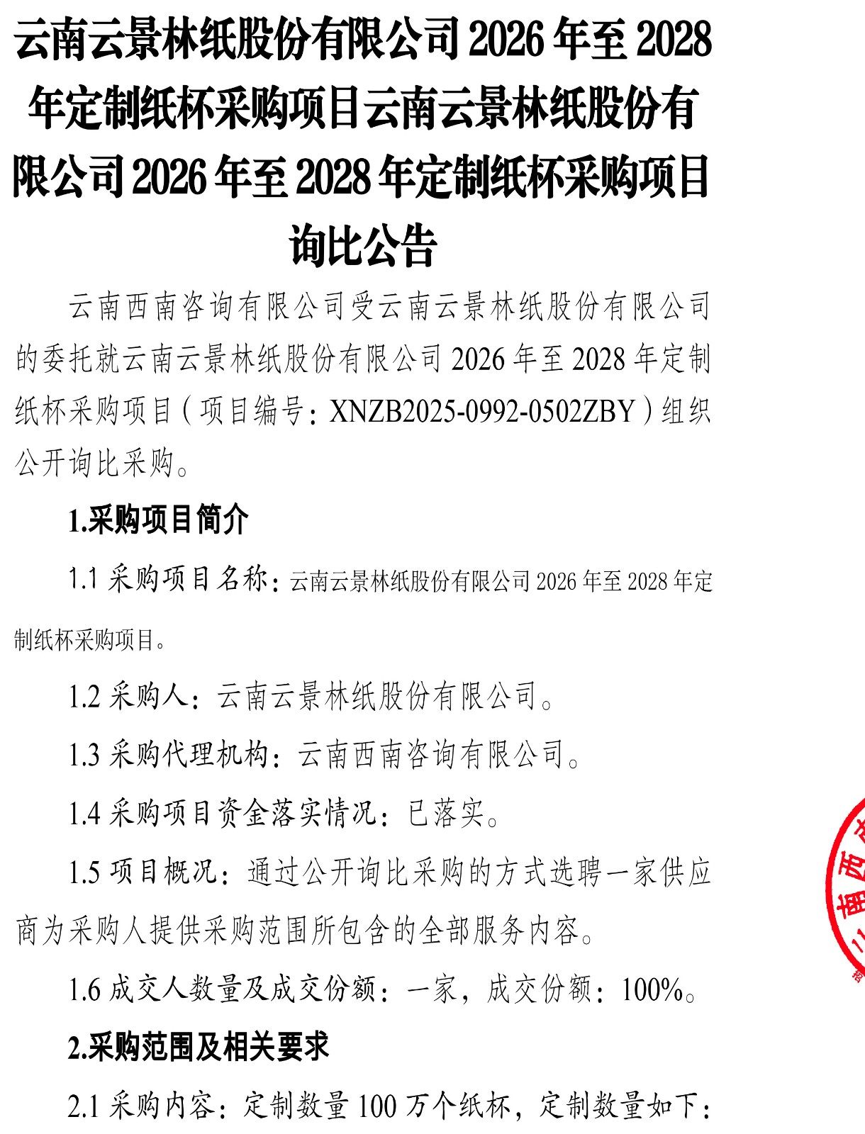 云南云景林紙股份有限公司2026年至2028年定制紙杯采購項目云南云景林紙股份有限公司2026年至2028年定制紙杯采購項目詢比公告