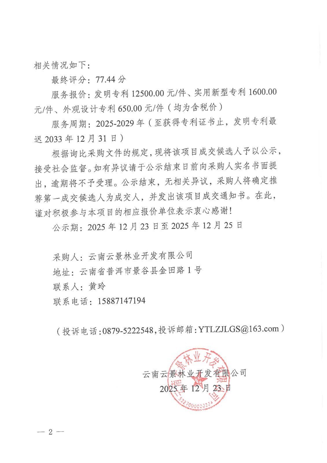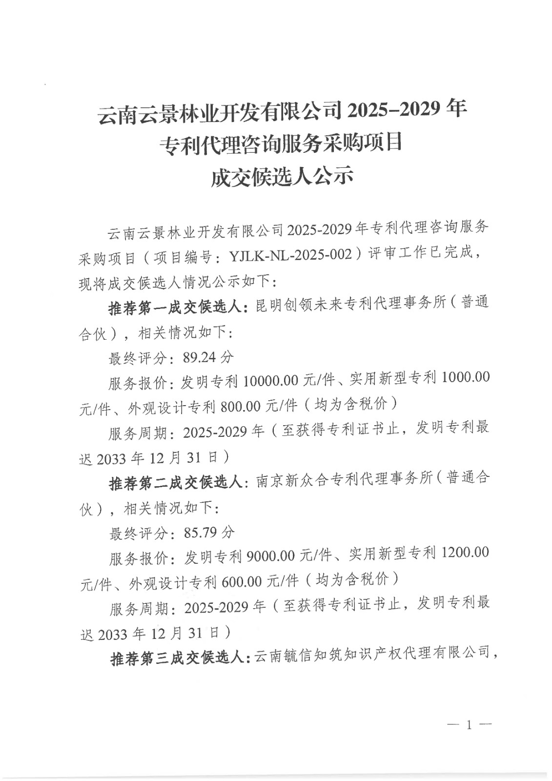 云南云景林業(yè)開發(fā)有限公司2025-2029年專利代理咨詢服務(wù)采購項目成交候選人公示