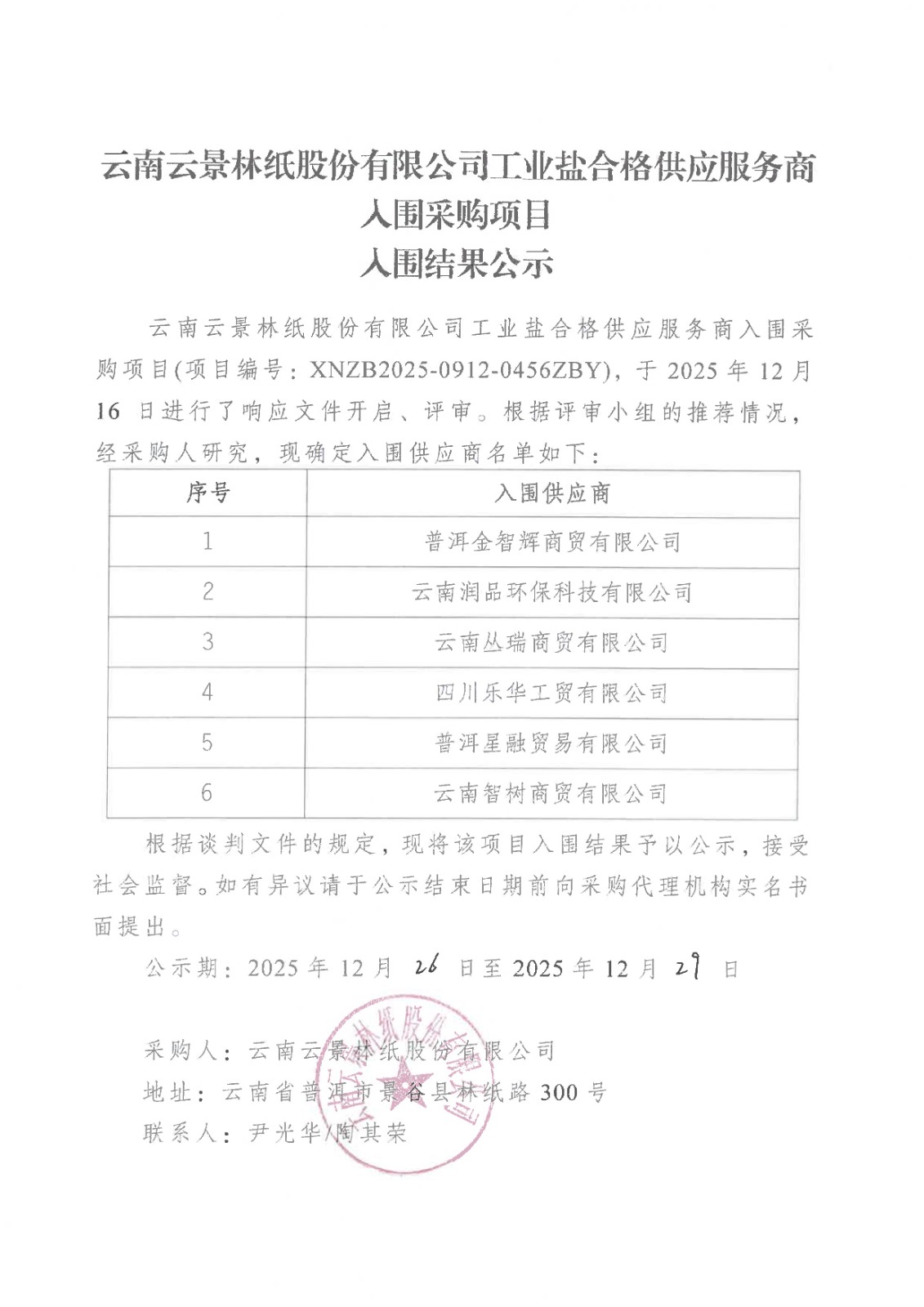 云南云景林紙股份有限公司工業(yè)鹽合格供應(yīng)服務(wù)商入圍采購(gòu)項(xiàng)目入圍結(jié)果公示
