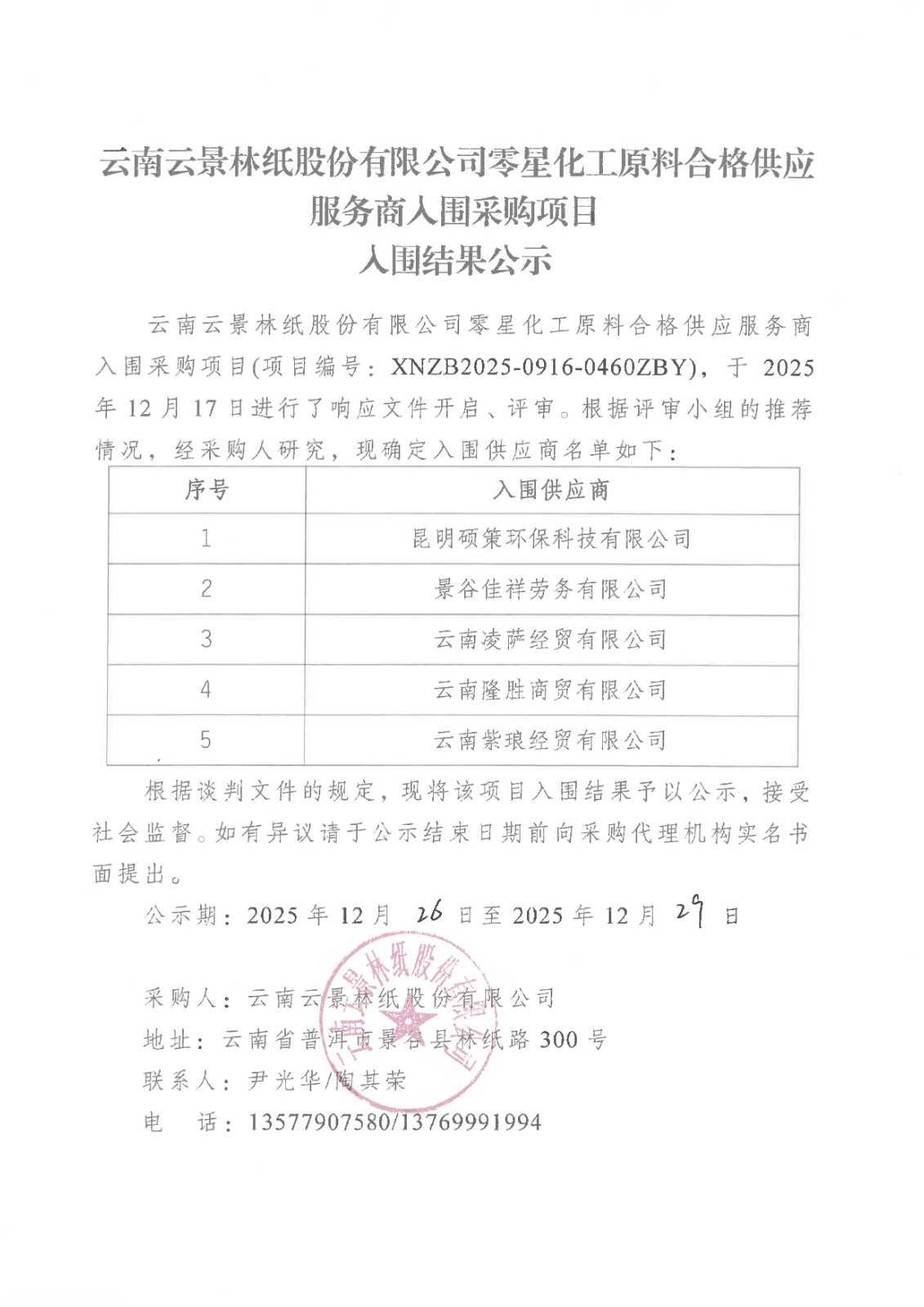云南云景林紙股份有限公司零星化工原料合格供應(yīng)服務(wù)商入圍采購(gòu)項(xiàng)目入圍結(jié)果公示