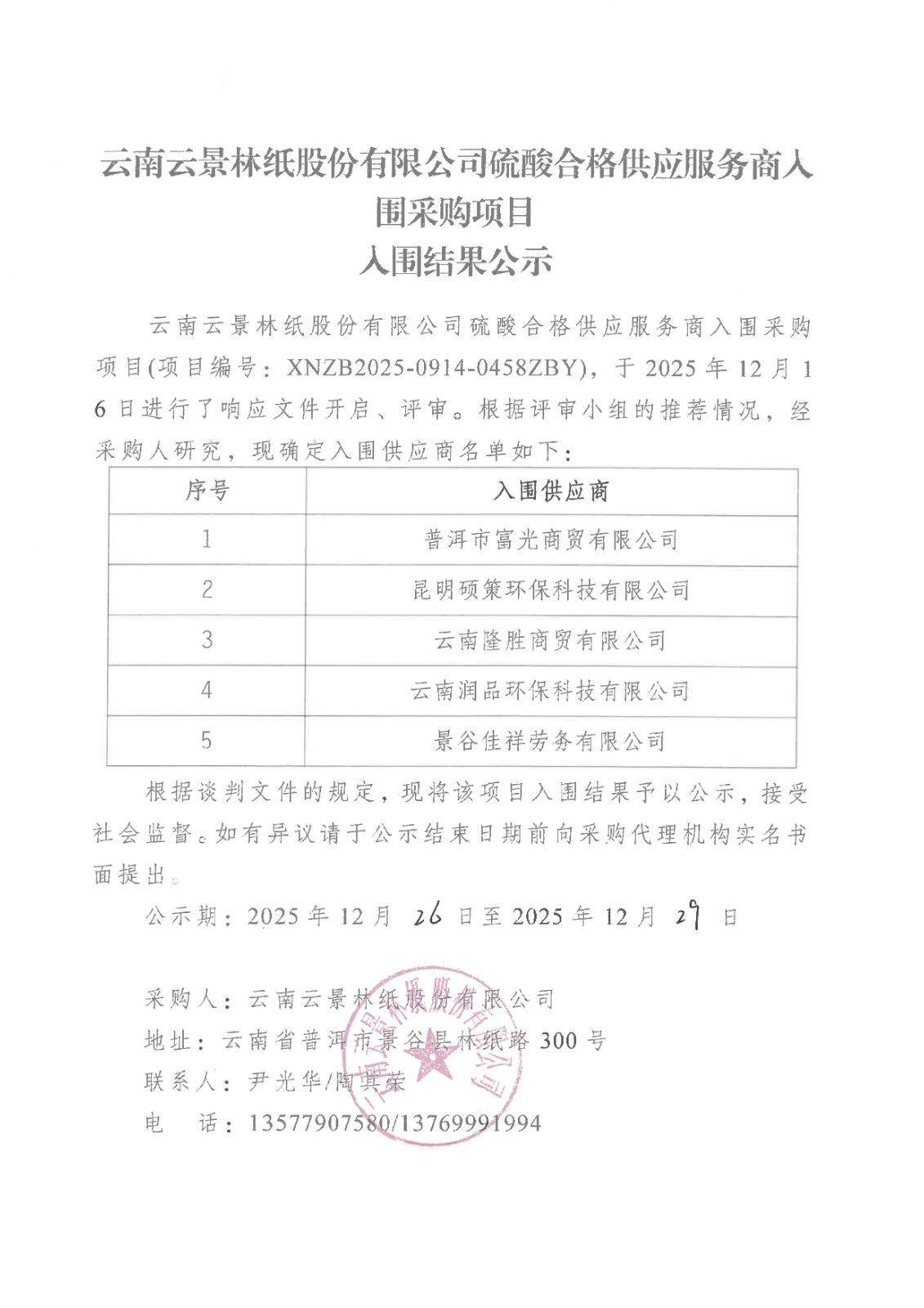 云南云景林紙股份有限公司硫酸合格供應(yīng)服務(wù)商入圍采購(gòu)項(xiàng)目入圍結(jié)果公示