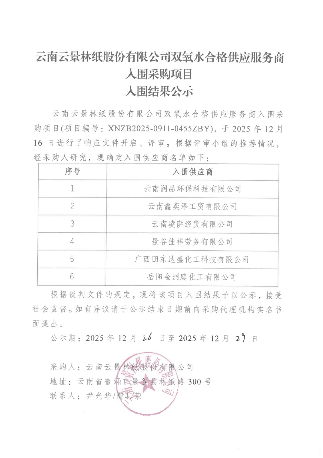 云南云景林紙股份有限公司雙氧水合格供應(yīng)服務(wù)商入圍采購項(xiàng)目入圍結(jié)果公示