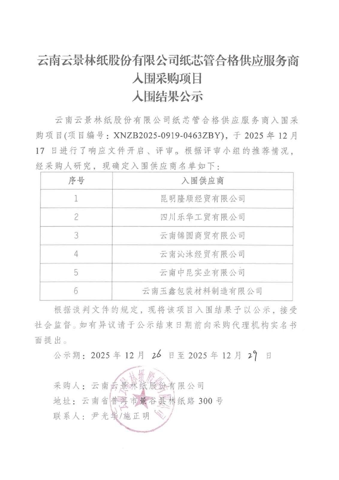 云南云景林紙股份有限公司紙芯管合格供應(yīng)服務(wù)商入圍采購項目入圍結(jié)果公示