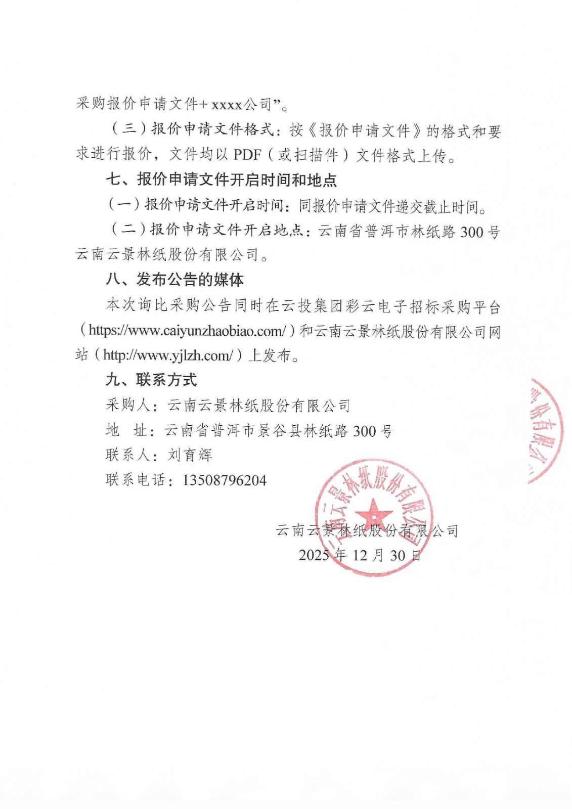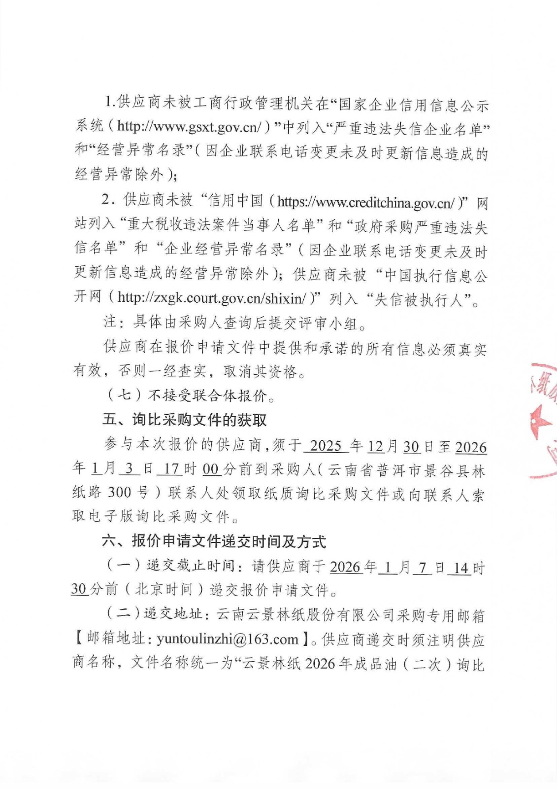 云南云景林紙股份有限公司2026年成品油(二次)詢比采購公告