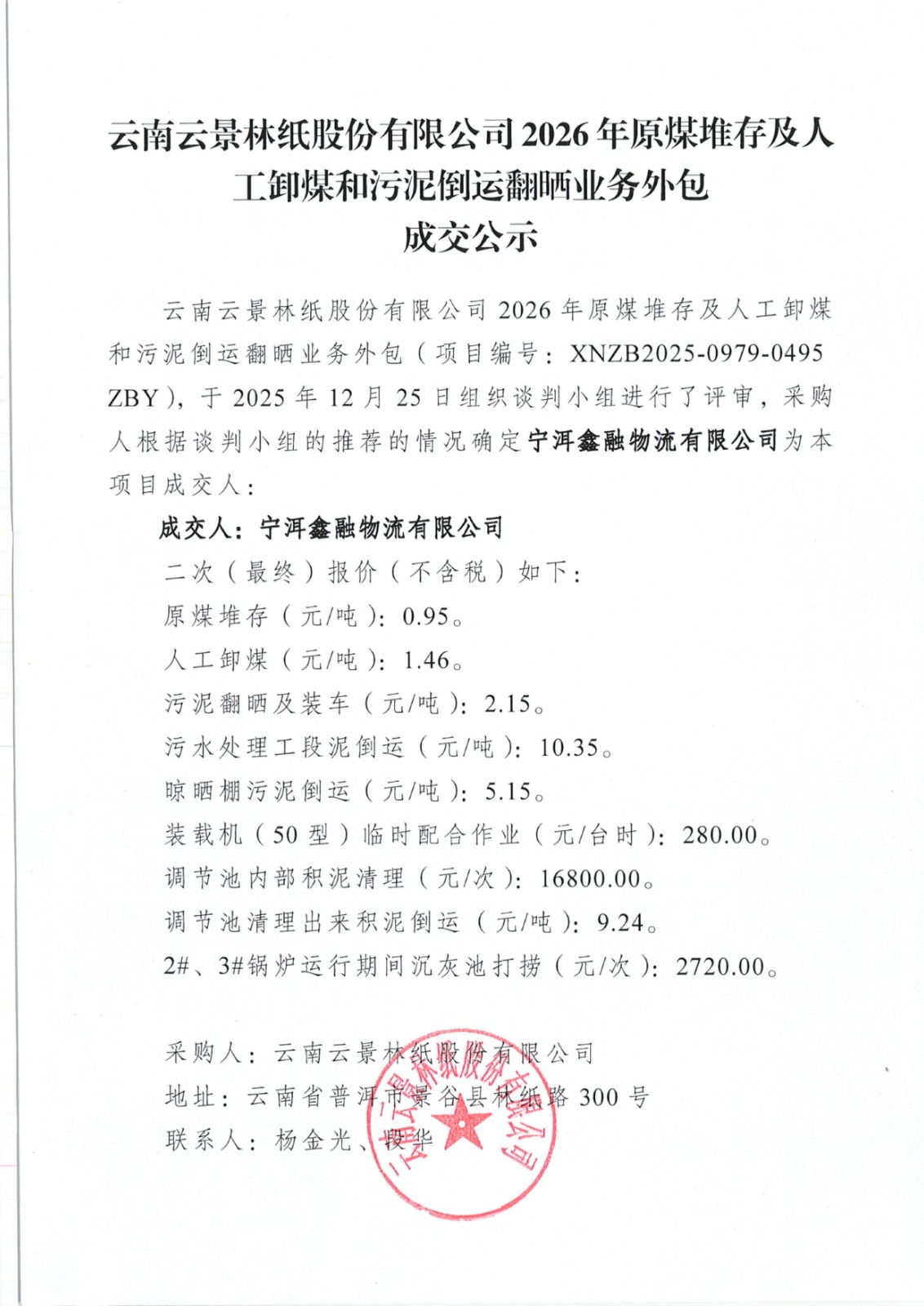云南云景林紙股份有限公司2026年原煤堆存及人工卸煤和污泥倒運(yùn)翻曬業(yè)務(wù)外包成交公示