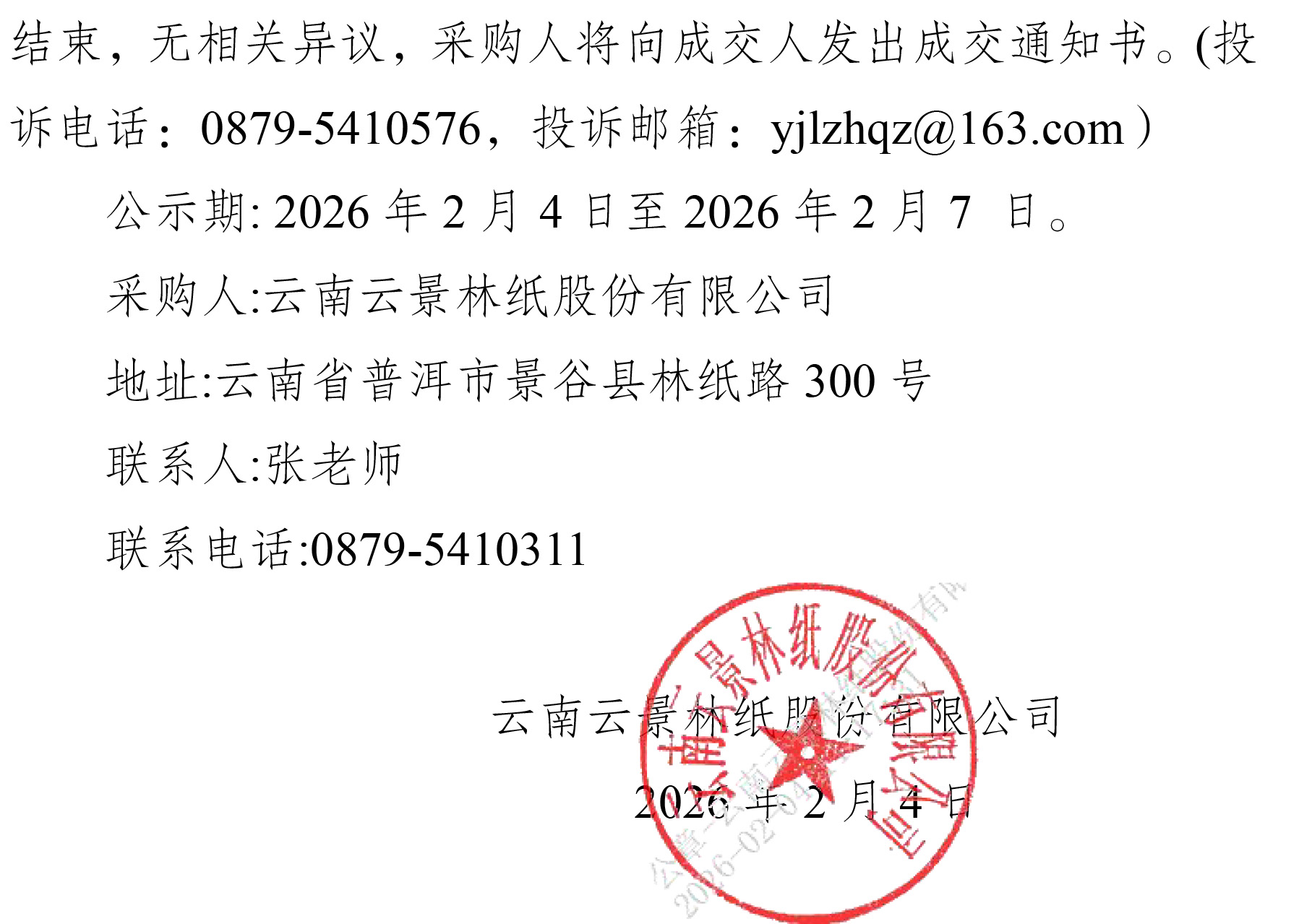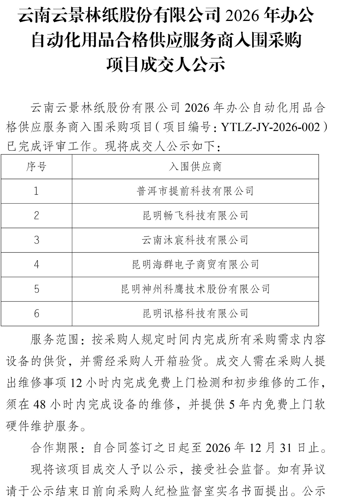云南云景林紙股份有限公司2026年辦公自動化用品合格供應(yīng)服務(wù)商人圍采購項目成交人公示