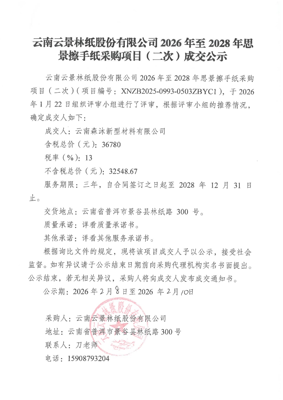 云南云景林紙股份有限公司2026年至2028年思景擦手紙采購項目(二次)成交公示